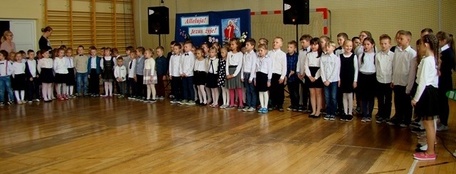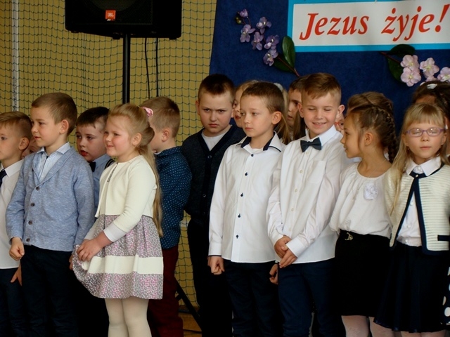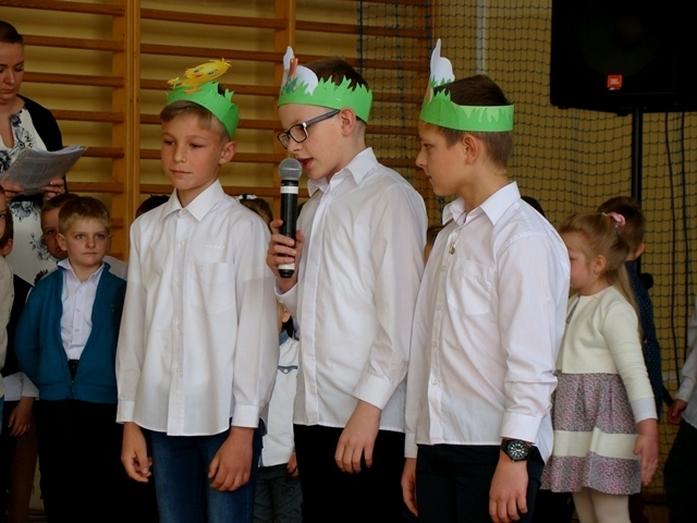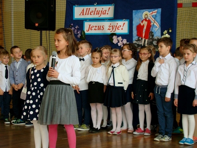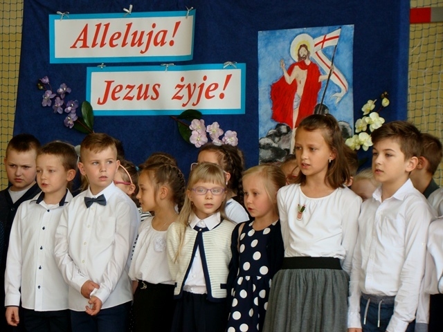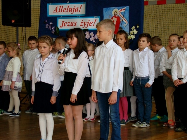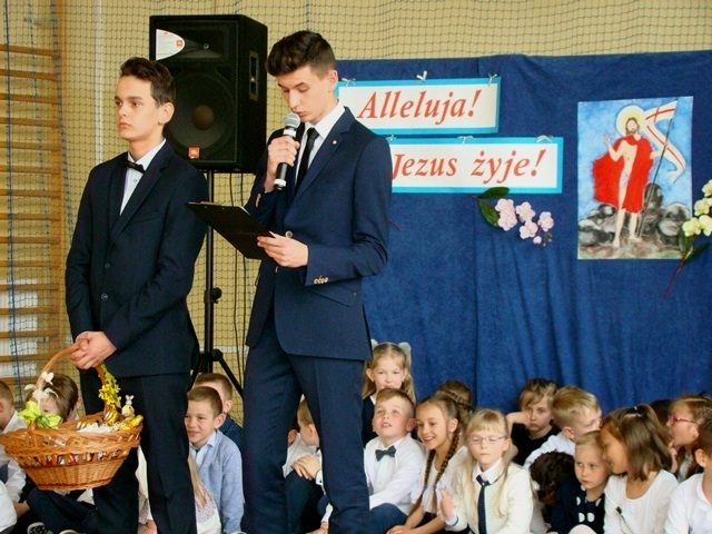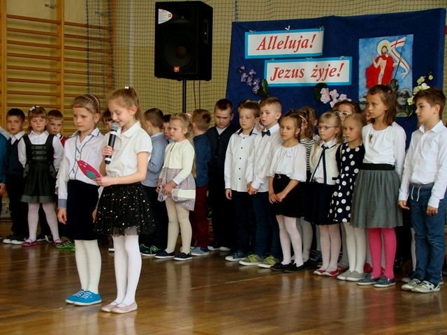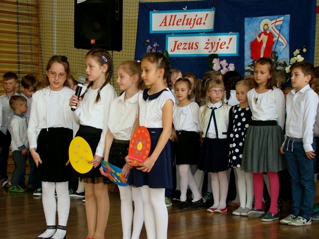 Na tegorocznym apelu z okazji nadchodzących Świąt Wielkanocnych zaprezentowali się uczniowie klas młodszych i oddziałów przedszkolnych naszej szkoły. Uroczyście wystrojona, liczna gromada dzieci przygotowana przez swoich opiekunów – panie: Cecylię Soboń, Krystynę Koszyk, Małgorzatę Tokarczyk, Barbarę Stelmach i Alinę Citak wystąpiła znakomicie, recytując wiersze i śpiewając świąteczne piosenki.