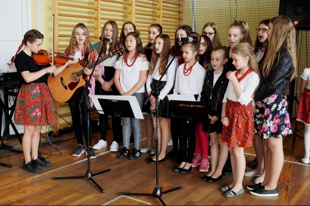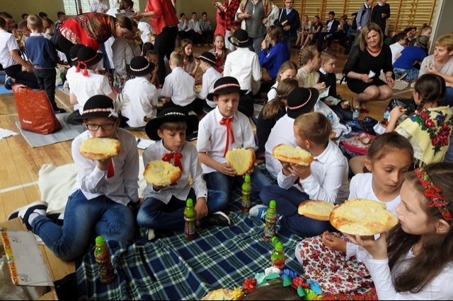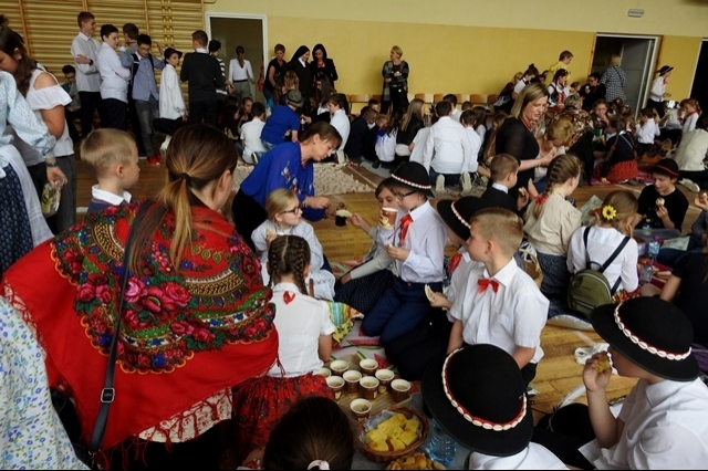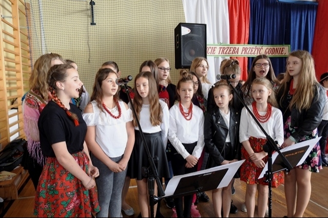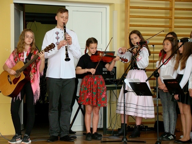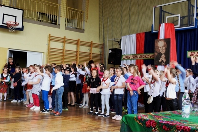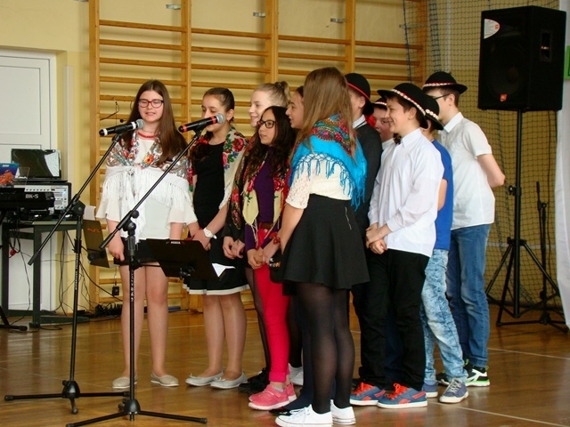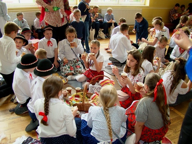 Po części oficjalnej nastąpiła ta chyba najbardziej oczekiwana przez uczniów – prezentacja swoich klas i szkoły w formie ułożonych przez siebie piosenek, do znanej ludowej melodii. Wzbogaceniem występu były elementy ludowego stroju, w których prezentowali się uczniowie oraz większość nauczycieli. Święto zakończył wspólny „piknik”, co prawda nie w plenerze, ale na kocach rozłożonych na sali gimnastycznej.