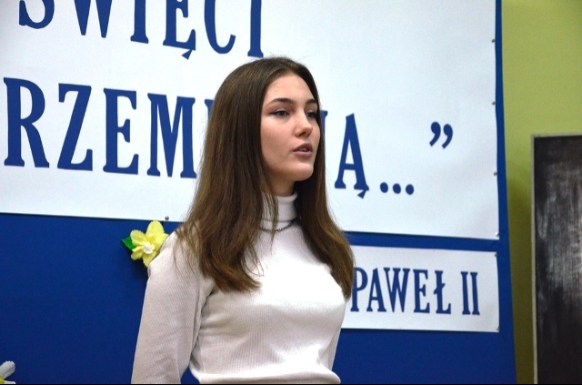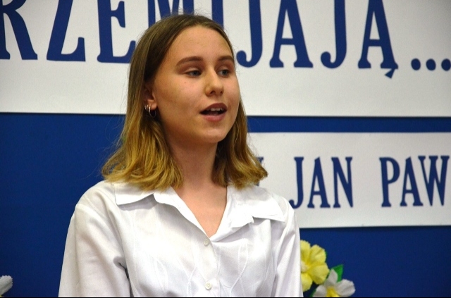 Uczestnicy konkursu recytowali niełatwą poezję, bo utwory św. Jana Pawła II. Chcąc wydobyć z tej twórczości kwintesencję treści, wzruszyć i skłonić do refleksji, należało wykazać się umiejętnością właściwej, głosowej interpretacji utworu oraz wrażliwością, która pozwalała „zasłuchać się” w tej niezwykłej, bogatej w treść poezji. Spośród wszystkich wystąpień naszych uczennic, jury konkursowe najbardziej ujęła recytacja Aliny Paduli, która zajęła II miejsce w konkursie. Uroczystość wręczenia dyplomów i nagród odbyła się 11 czerwca.