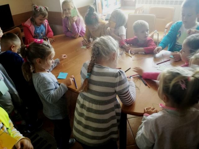 Na pierwszym spotkaniu dzieci zapoznały się z główną bohaterką serii książeczek. Na zakończenie spotkania otrzymały wizytówki, które własnoręcznie ozdobiły. Zajęcia dały dzieciom dużo radości. Każdy dumnie prezentował swoje prace.