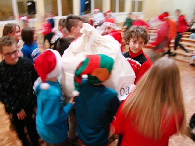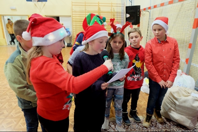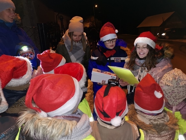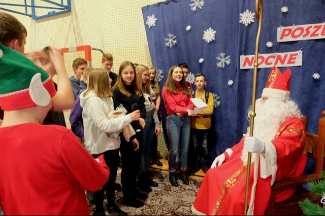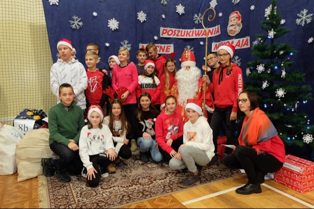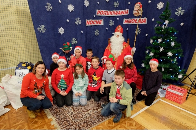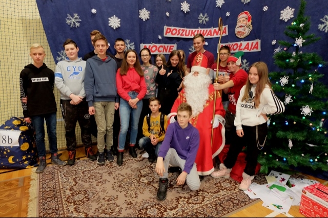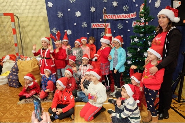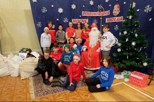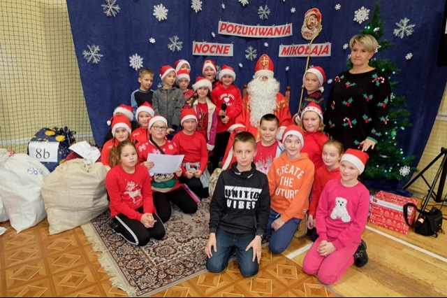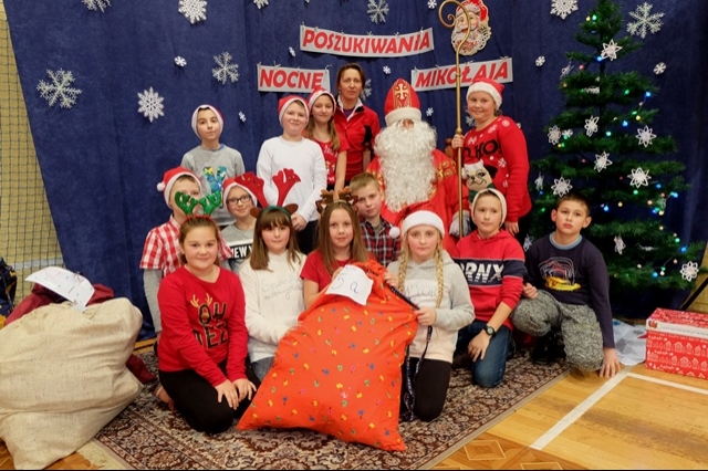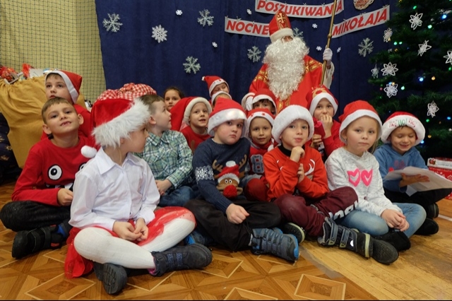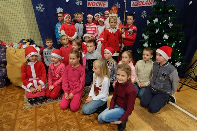 Nocne poszukiwania świętego Mikołaja w naszej szkole stało się już tradycją. Zawsze 6 grudnia uczniowie, nauczyciele, rodzice i strażacy miejscowej jednostki Ochotniczej Straży Pożarnej uczestniczą w tej niecodziennej imprezie, tak oczekiwanej, szczególnie przez najmłodszych. W tym roku Mikołaj przyszedł nieco wcześniej, bo 5 grudnia. Podobno wszyscy byli grzeczniejsi... Wyjątkową atmosferę nadchodzących wydarzeń dało się odczuć już na porannych lekcjach. Uroczystość o godzinie 16 - tej rozpoczęła msza święta pod przewodnictwem księdza Jana Wąchały. Następnie do akcji „wkroczyli” harcerze, którzy zgodnie z zaplanowanym harmonogramem odprawiali poszczególne klasy na trasę rajdu, dostosowaną do możliwości wiekowych uczniów. Trzeba obiektywnie przyznać, że organizatorzy Małgorzata i Piotr Jarząbowie oraz pani Iwona Ogorzały wykazali się nie lada pomysłowością opracowując plan przejścia grup. Dodatkową trudność stanowiły zadania przygotowane dla poszukujących Mikołaja, które przekazywali stojący na poszczególnych punktach harcerze z rodzicami i strażakami. Po przebyciu trasy, mimo chłodu i wiatru w doskonałych nastrojach wszyscy dotarli do budynku szkoły, gdzie przed spotkaniem z Mikołajem mogliśmy się ogrzać herbatą przygotowaną przez rodziców oraz zjeść drożdżówkę, która w tym dniu smakowała wyjątkowo… Potem w sali gimnastycznej następował najważniejszy punkt dnia – spotkanie z Mikołajem. Każda klasa przed otrzymaniem prezentów odczytywała list, a potem śpiewała przygotowaną wcześniej piosenkę. Kulminacją wydarzeń był prezent od Mikołaja i klasowe zdjęcie ze Świętym…