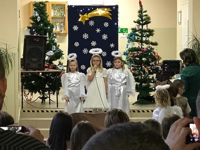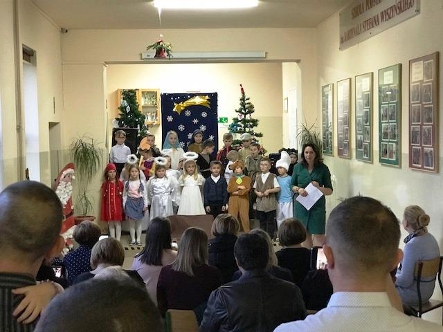 Swoją obecnością zaszczyciła zaproszonych gości Pani Wicedyrektor Anna Golonka. Wychowawczyni klasy I pani Alina Citak przywitała wszystkich zebranych i zaprosiła do tworzenia wspólnie świątecznego nastroju poprzez włączenie się w śpiewanie kolęd.