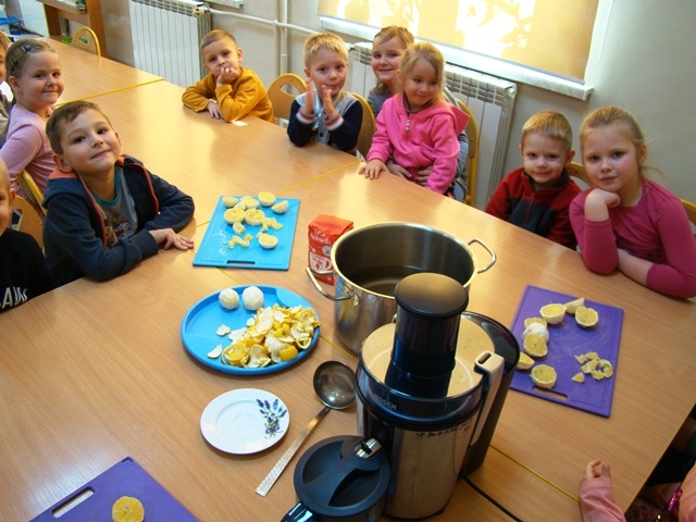 W ramach akcji „Zdrowo i sportowo” dzieci z grupy 0-1 postanowiły wspólnie z nauczycielką przygotować pyszną, zdrową lemoniadę. Przed przystąpieniem do pracy starannie umyły ręce oraz owoce. Następnie każde dziecko samodzielnie wyciskało sok z cytryny za pomocą wyciskarki. Radość była ogromna, każdy niecierpliwie czekał na degustację. Dzieci z zaciekawieniem próbowały plasterków cytryny, określały jej smak i zapach. Z zapartym tchem śledziły ilość przybywającego soku. Dolewały wody, żeby lemoniada smakowała jeszcze lepiej przedszkolaki dodały trochę cukru. Kiedy wszystkie składniki zostały połączone, nastąpiła degustacja wspólnie przygotowanej lemoniady.