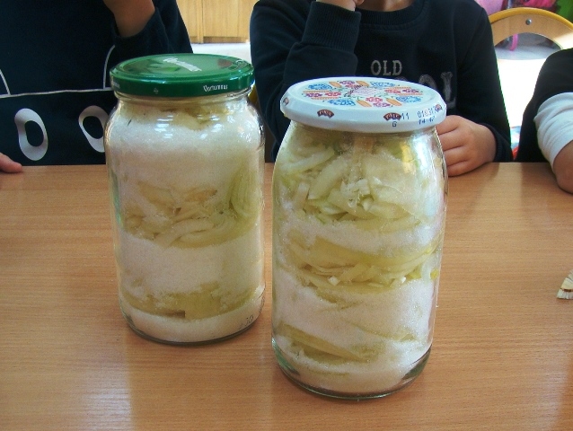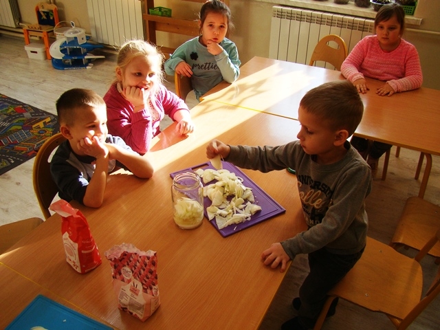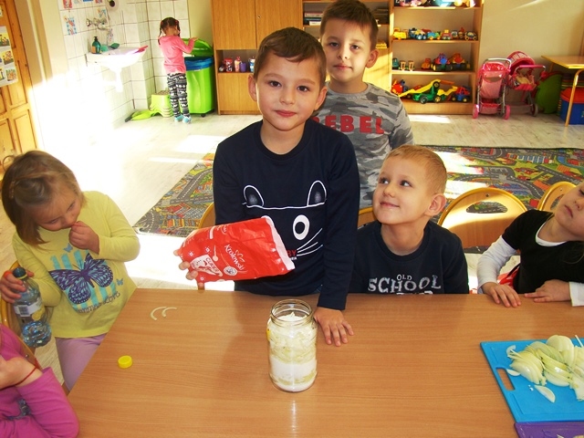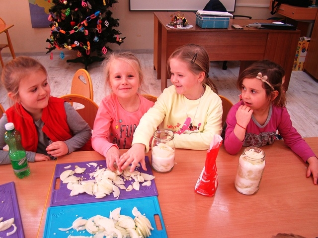Zimowa pora, niestety, obfituje w różne choroby, dlatego dzieci z klasy 0-1 postanowiły wzmocnić swoją odporność i samodzielnie przygotować syrop z cebuli. Była to doskonała okazja do zabawy i nauki. Dzieci sprawdzały smak i zapach tego warzywa, dowiedziały się również, co znaczy „ubrany na cebulkę”. Było bardzo radośnie, ale też nie obyło się bez łez! Jednak wszystko się udało, czas na degustację nadszedł po 2 dniowym leżakowaniu naszej zdrowej mikstury. Wszystkim odważnym przedszkolakom syrop bardzo smakował. Dzieci były bardzo zdziwione, że syrop wcale nie smakuje jak cebula, a na dodatek jest słodziutki. Mniam…!