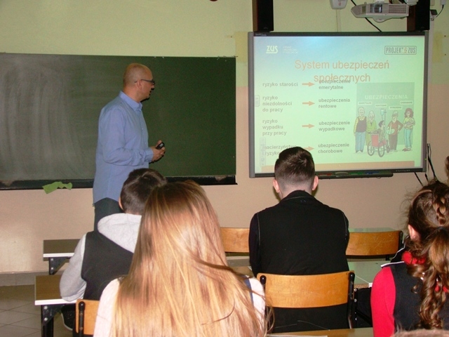 Każda z tych klas miała oddzielne zajęcia, na których uczniowie poznali rodzaje ubezpieczeń społecznych. Przekonali się, że temat ten również dotyczy ich bezpośrednio. Pan Tomasz wyjaśnił, jak w Polsce wygląda sytuacja ubezpieczeń i dlaczego każdy musi być ubezpieczony aby w razie wypadku czy choroby mógł liczyć na pomoc i opiekę medyczną. Spotkanie z pracownikiem ZUS-u było też okazją, aby dowiedzieć się, jak wygląda praca w ZUS i jakie kwalifikacje musi posiadać pracownik administracji publicznej. Podczas spotkania uczniowie mogli skorzystać w praktyce z wiedzy zdobytej podczas zajęć z doradztwa zawodowego, zadając prowadzącemu pytania.