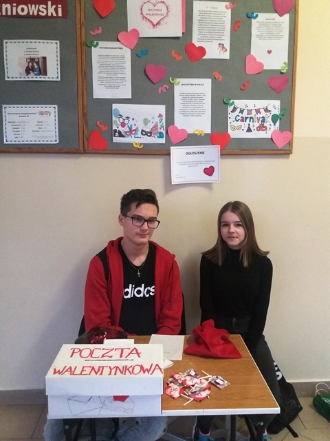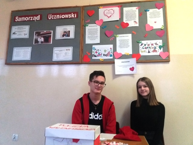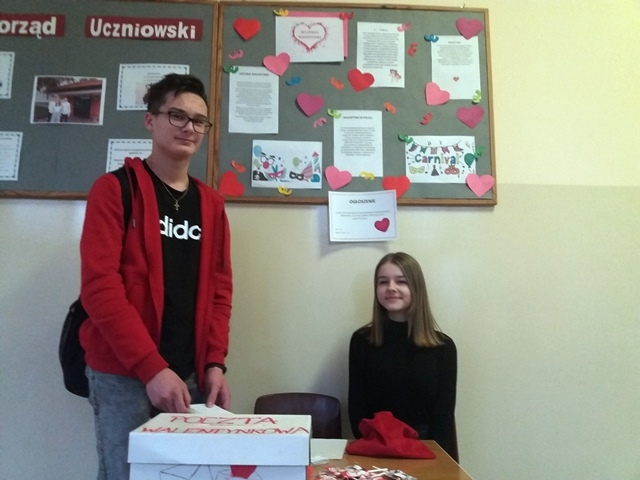 W piątek 14 lutego Rada Samorządu Uczniowskiego z okazji Walentynek przygotowała dla uczniów małą niespodziankę. Na gazetce ściennej pojawiły się cenne informacje dotyczące tego popularnego wśród młodzieży święta. Były także krótkie życzenia i wierszyki, pomocne w napisaniu kartki walentynkowej. Na przerwach każdy mógł wysłać kartkę walentynkową oraz ją otrzymać od cichego wielbiciela. Również dużym zainteresowaniem cieszyły się lizaki walentynkowe, które można było wylosować. Na lizaku była literka imienia przyszłej Walentynki lub Walentego. Było przy tym dużo śmiechu i zabawy. Dzień ten upłynął w radosnej, pełnej życzliwości atmosferze ponieważ każdy lubi być obdarowywany.