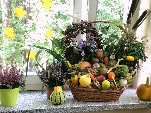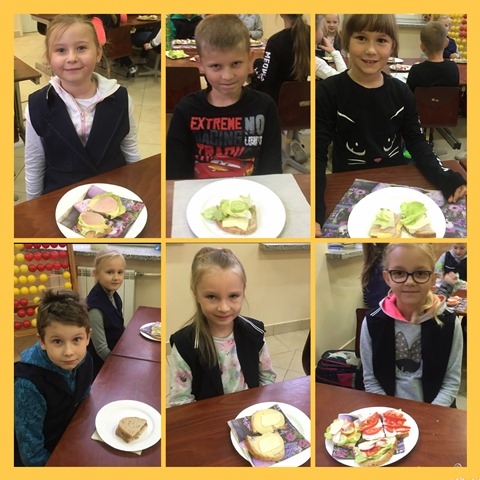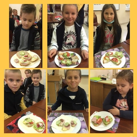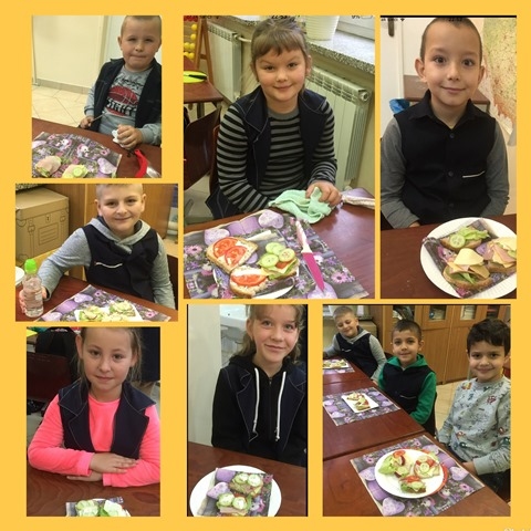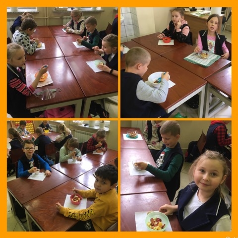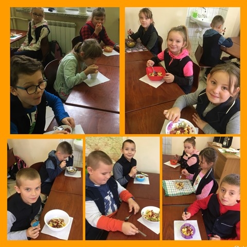 Wspólnie z wychowawczynią panią Aliną Citak wypełnili okazały kosz darami jesieni, który przez cały miesiąc zdobił salę lekcyjną. Następnie wykonali piramidę żywieniową oraz układali dzienny jadłospis. Degustowali różnorodne warzywa i owoce z polskich ogrodów i sadów poznając ich walory smakowe. Samodzielnie wykonali kanapki, które kulturalnie spożywali podczas przerwy śniadaniowej. Innym razem pokroili owoce i skomponowali wyśmienitą sałatkę owocową. Wszystkie dzieci były bardzo zaangażowane w zajęcia. Ugruntowały swoją wiedzę na temat właściwego odżywiania. Uznały, że zajęcia, na których samodzielnie przygotowują i konsumują posiłki są najlepsze !