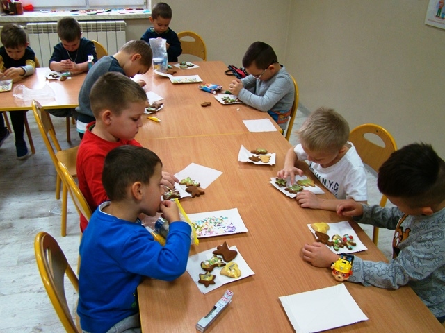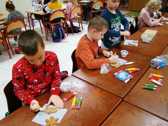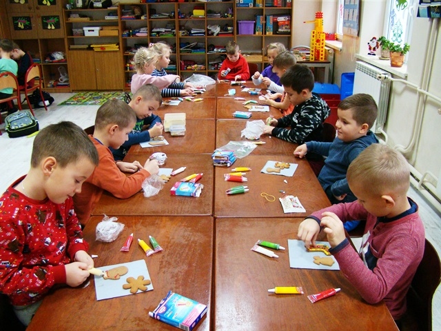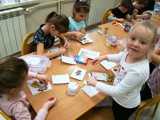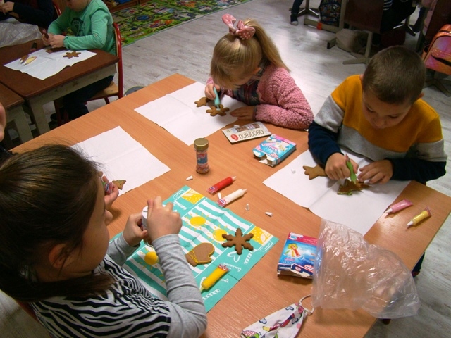 Poprzez wspólne działanie, samodzielne doświadczanie dzieci kultywowały tradycję, pobudzały inwencję twórczą, a przede wszystkim odczuwały radość z przygotowań świątecznych. Dzieci z oddziałów 0-1 i 0-2 również rozpoczęły intensywne przygotowania. Wytworem naszych przygotowań były własnoręcznie przez dzieci ozdabiane pierniczki, kolorowe łańcuchy i ozdoby na choinkę, ale największą radością było strojenie choinki w salach.