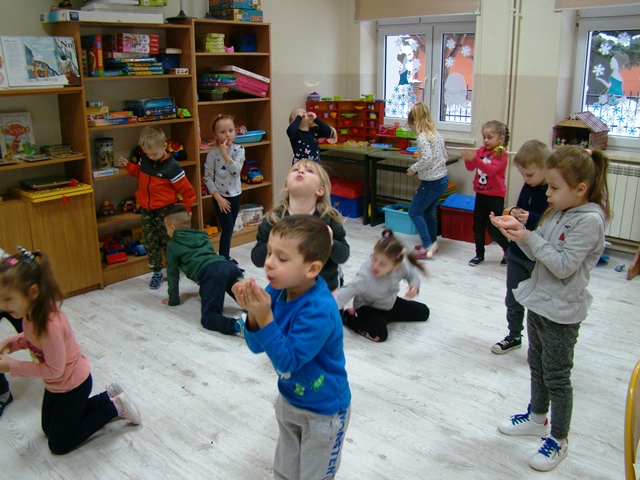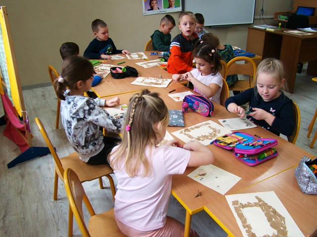 W bloku tematycznym o dokarmianiu ptaków dzieci poznały najpierw ptaki zimujące w Polsce i nauczyły się je rozpoznawać. Dowiedziały się, jaki pokarm smakuje najbardziej ptakom goszczącym w naszych „stołówkach” i zatroszczyły się, by niczego dla nich nie zabrakło. Wokół tematyki dokarmiania ptaków odbywały się również zajęcia ruchowe z elementami ćwiczeń logopedycznych z wykorzystaniem piórek oraz powstawały różnorodne prace plastyczne.
