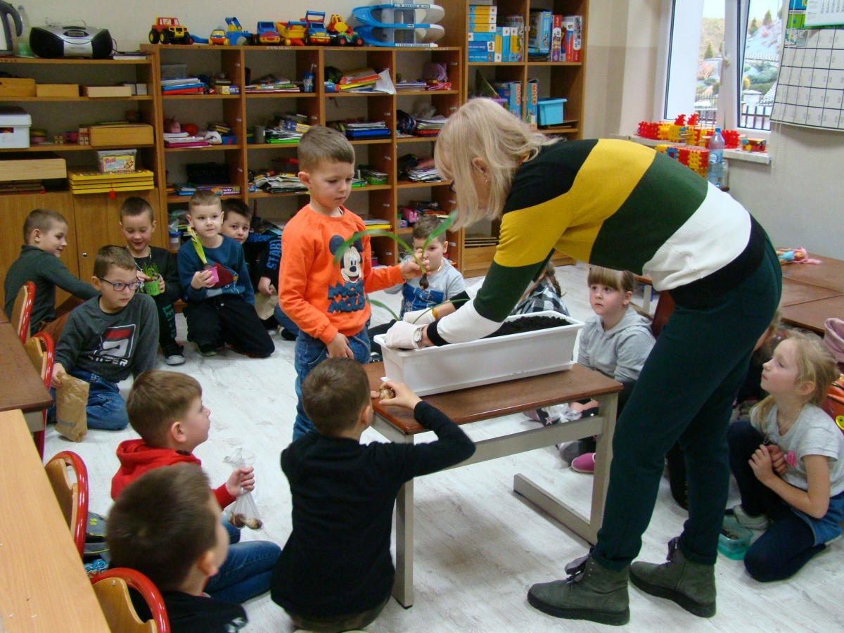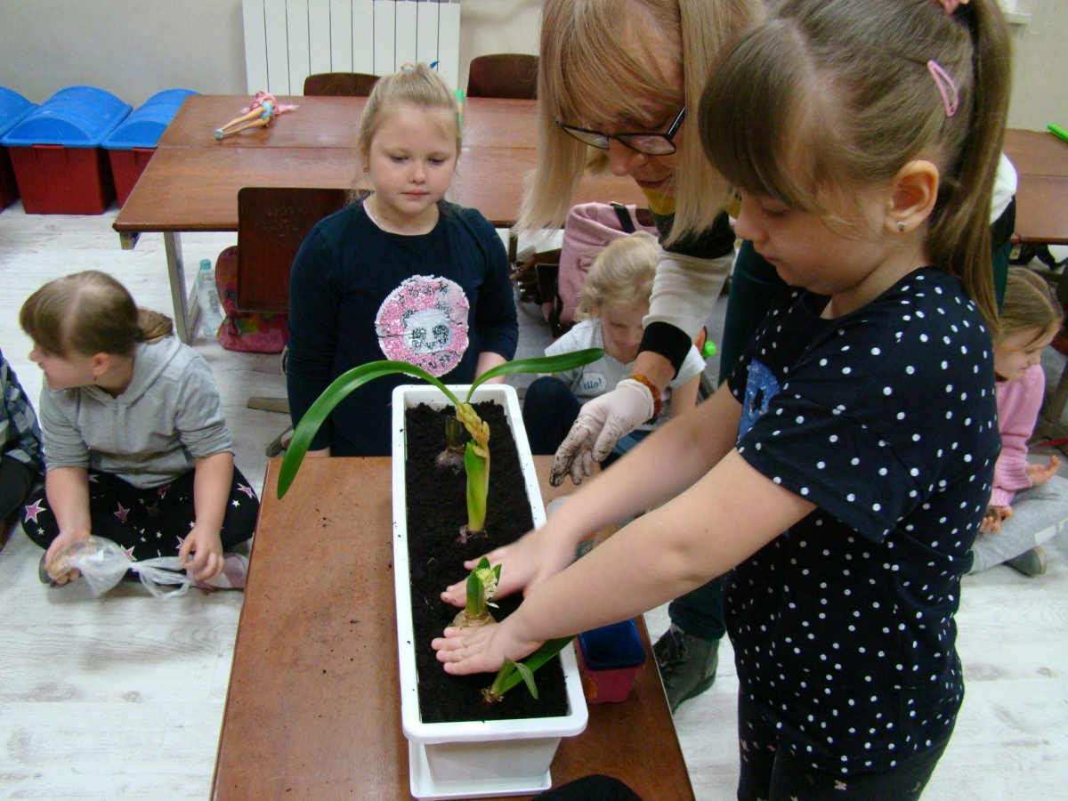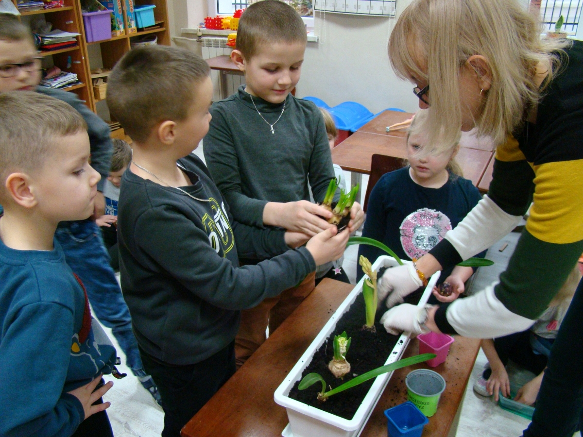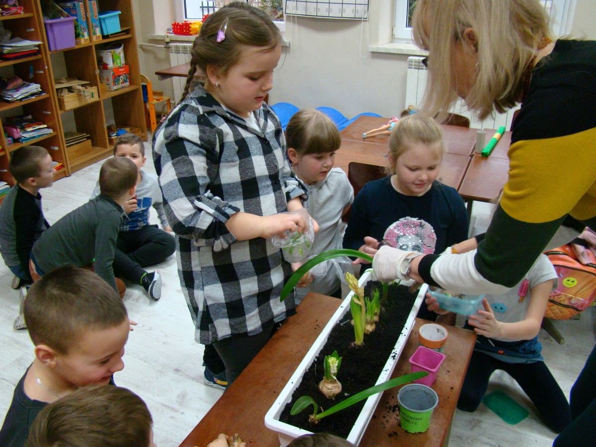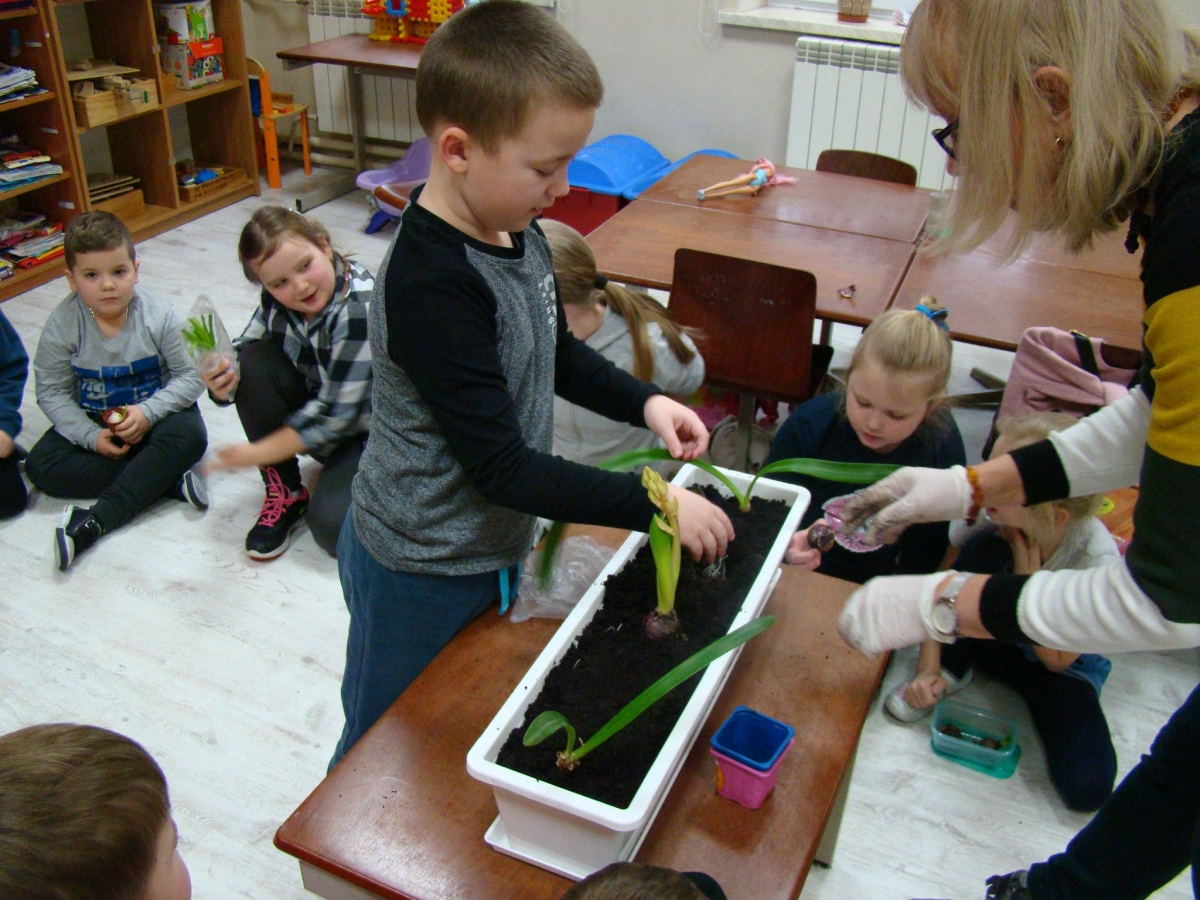Przedwiośnie... nareszcie, wszyscy cieszymy się patrząc na budzący się do życia świat. Postanowiliśmy wprowadzić trochę przedwiośnia do sali przedszkolnej i posadziliśmy cebulki kwiatów w dużej donicy.