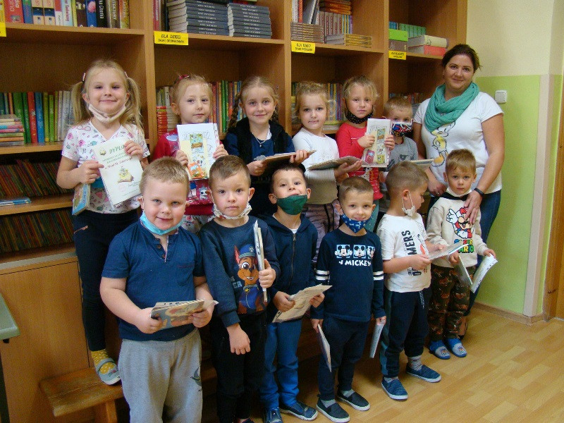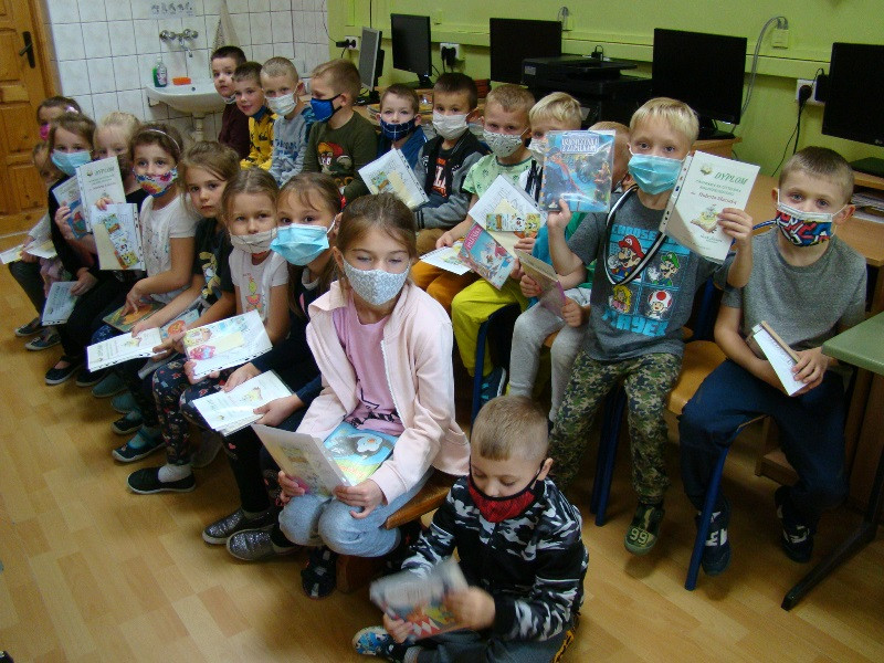 Dnia 19 października dzieci z oddziałów przedszkolnych 0-1 i 0-2 wraz ze swoimi wychowawczyniami p. Cecylią Soboń i p. Agnieszką Gryboś odwiedziły Bibliotekę szkolną.