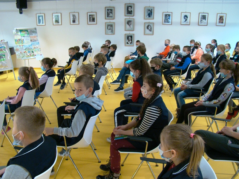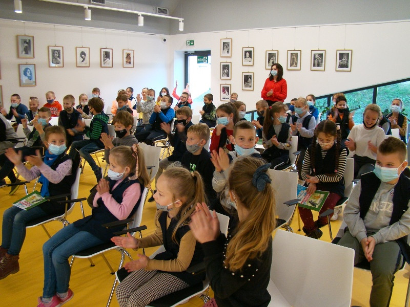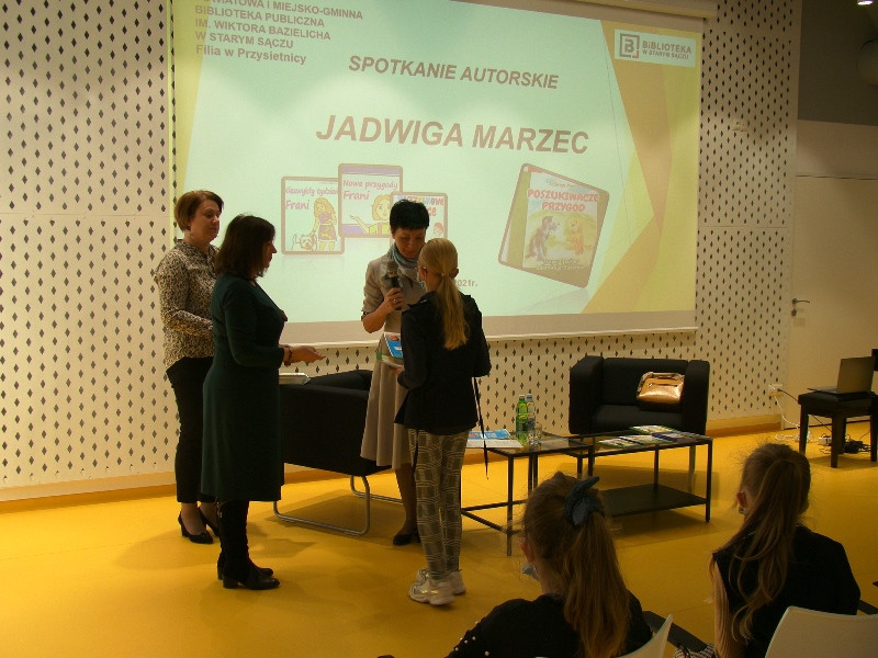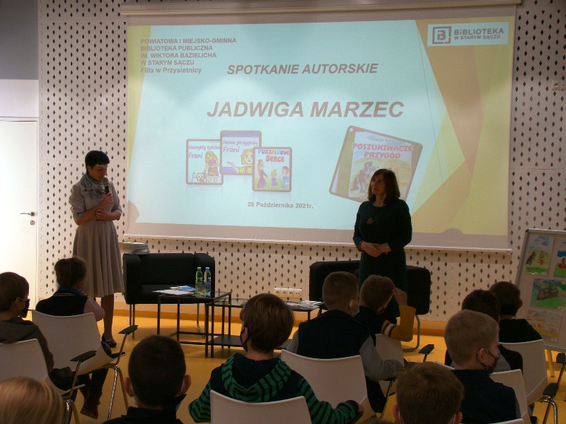 28 października uczniowie klasy II i III uczestniczyli w spotkaniu autorskim z panią Jadwigą Marzec – autorką książek dla dzieci i dorosłych. Na wydarzenie zaproszonych zostało także kilkoro uczniów z innych klas, uczestników konkursu plastycznego na ilustrację do książki „Poszukiwacze przygód Traper i Lukier odkrywają Sądeckie”, którego rozstrzygnięcie nastąpiło w wakacje, a rozdanie nagród odbyło się podczas imprezy pod hasłem „Narodowe czytanie” w Bibliotece Powiatowej w Starym Sączu. Warto przypomnieć, że w konkursie uczestniczyło dużo uczniów z naszej szkoły, z których wielu zostało nagrodzonych i wyróżnionych, a ich prace plastyczne zdobią kartki książki o sądeckich przygodach wesołych piesków. Spotkanie z autorką było okazją do obdarowania przez pisarkę egzemplarzami swojej książki wszystkich uczestników konkursu.