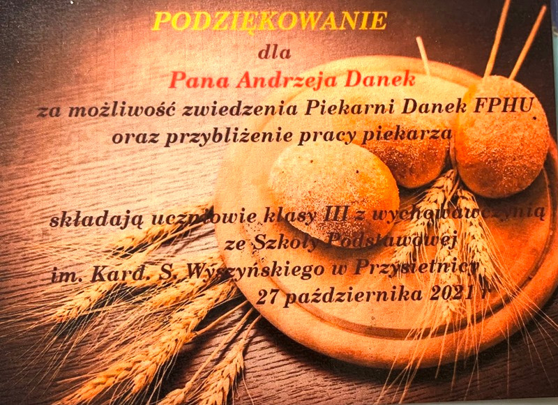 27 października wszyscy trzecioklasiści pod opieką wychowawczyni pani Aliny Citak i dwóch mam wyjechali na wycieczkę do Nowego Sącza, do Piekarni Danek. Tam, na miejscu wśród wspaniałego zapachu pieczonego chleba, przywitała uczniów pani Agnieszka, która przewodniczyła w zwiedzaniu zakładu.