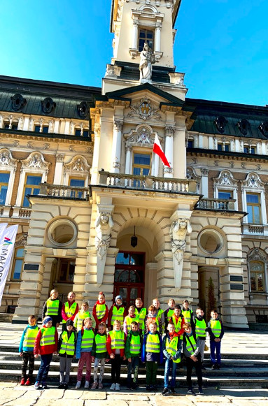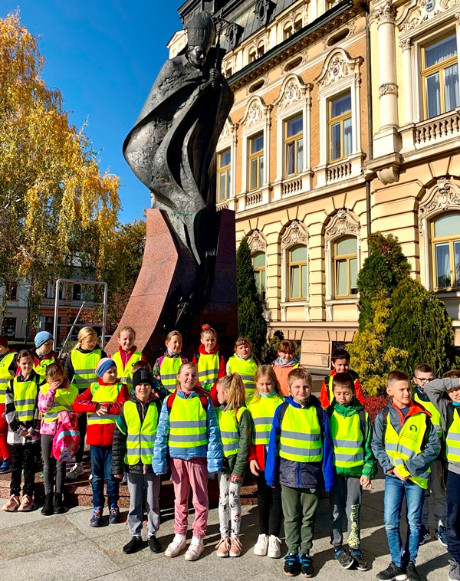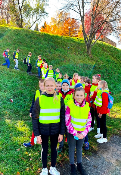 Posileni świeżymi i smacznymi rogalikami udali się na jesienny spacer, głównymi ulicami Nowego Sącza. Zobaczyli Rynek, a na nim gołębie, Ratusz, który wybijał godzinę 12.00,  Ruiny Zamku w jesiennym dywanie z liści i Zegar, na którym pracowali panowie ogrodnicy i zmieniali tarczę na barwne, kwitnące bratki.