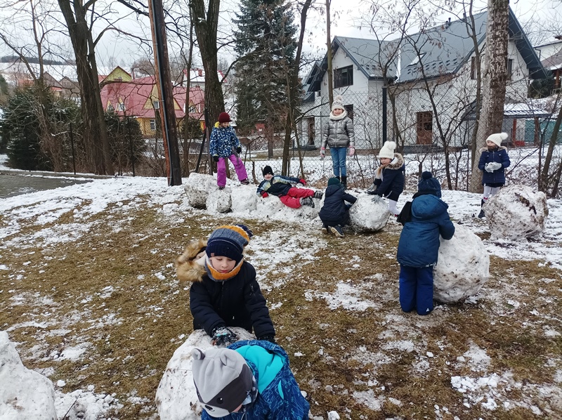 Zima jest uwielbianą porą roku, zwłaszcza kiedy jest śnieg. Z tego powodu dzieci z klasy 0-1 i 0-2 dbając o zdrowie i hartując organizm wybrały się na szkolny plac zabaw. Wreszcie mogliśmy urządzić wesołe harce i zabawy na śniegu. Dzieci całkowicie oddając się śniegowej zabawie urządziły konkurs na największą kulę śnieżną. Zgromadzone kule potem stały się fortecą śnieżną i torem przeszkód. Dzieci wykazały się niezwykłą pomysłowością w szaleństwach na zasypanym śniegiem placu zabaw. Lekki mrozik nikomu nie przeszkadzał, a do szkoły wróciliśmy z uśmiechami na buziach.