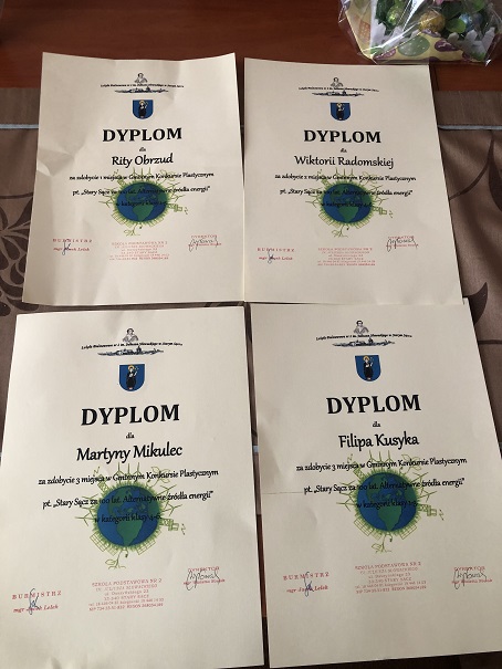 22.04. 2022 r. w Szkole Podstawowej nr 2 w Starym Sączu odbyły się uroczyste obchody Dnia Ziemi połączone z ogłoszeniem wyników i nagrodzeniem zwycięzców Gminnego Konkursu Plastycznego pod Honorowym Patronatem Burmistrza Starego Sącza Jacka Lelka. W kategorii uczniów klas 0 - III uczennica klasy II Rita Obrzud zajęła I miejsce, a III miejsce w tej kategorii zajął uczeń klasy Ia Filip Kusyk. W kategorii klas IV – VI uczennica klasy IV Wiktoria Radomska zajęła II miejsce. Z tej samej klasy uczennica Martyna Mikulec zajęła miejsce III. Radość dzieci z otrzymanych miejsc oraz nagrody rzeczowe sprawiły im ogromną radość i satysfakcję.