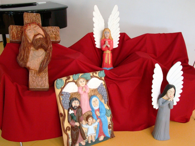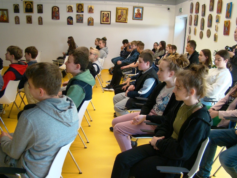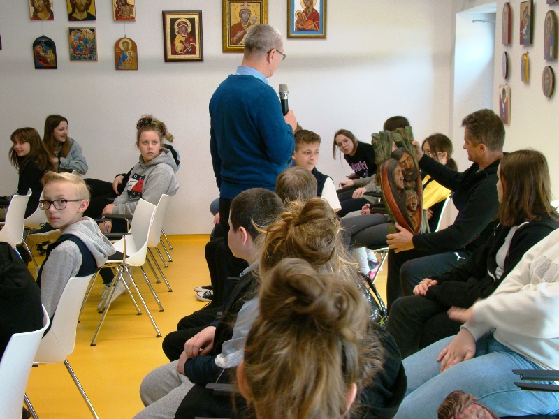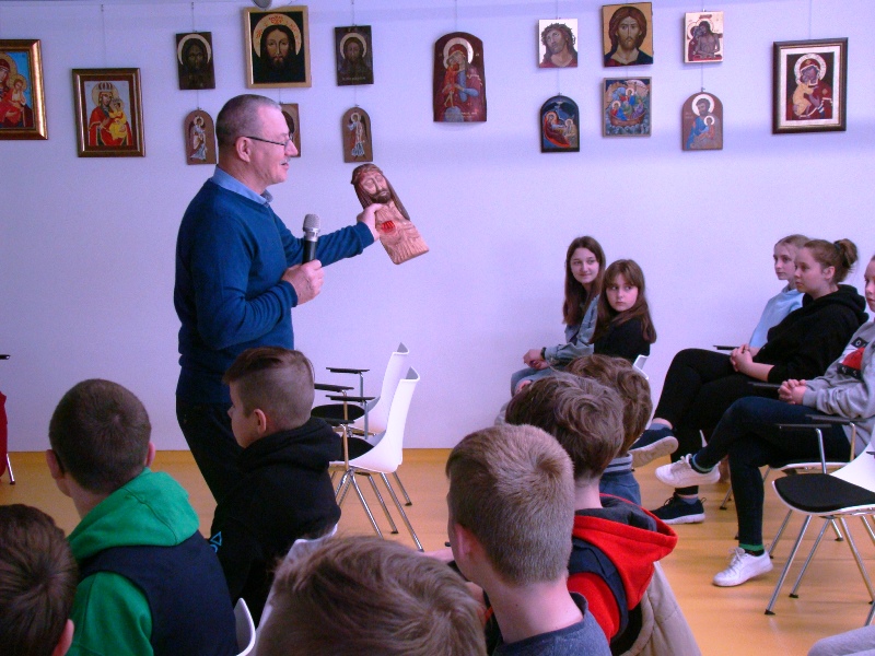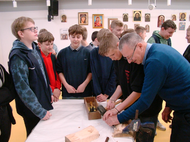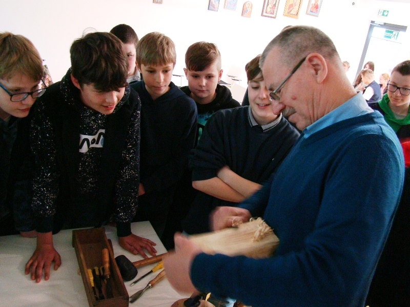 Pan Władysław przywiózł ze sobą swoje prace: rzeźby i płaskorzeźby, opowiadał uczniom o swojej pasji do tworzenia w drewnie i cechach ludowej twórczości. Prezentował narzędzia rzeźbiarskie, zwracał uwagę na umiejętne posługiwanie się każdym z nich. Odpowiadał na wszystkie pytania zadawane przez słuchaczy, którzy jednocześnie mieli okazję zapoznać się z bogatą kroniką twórczości Pana Oleksego.