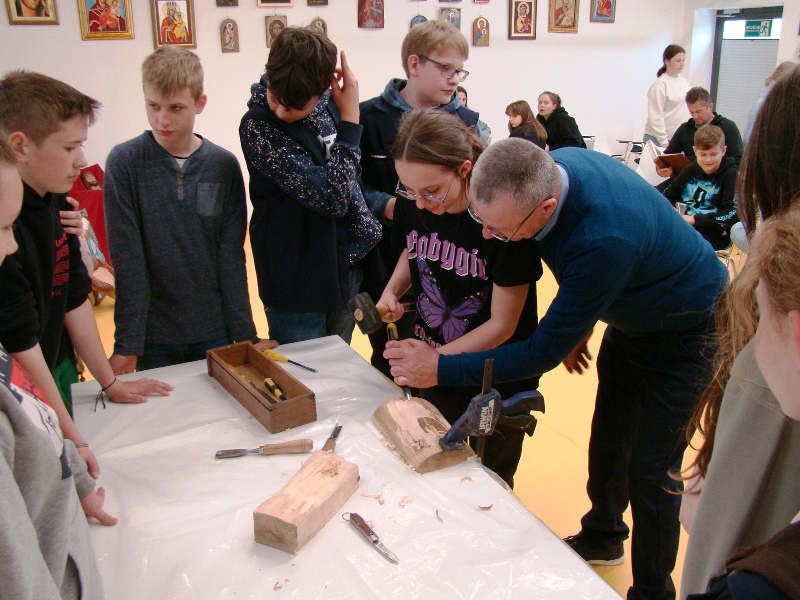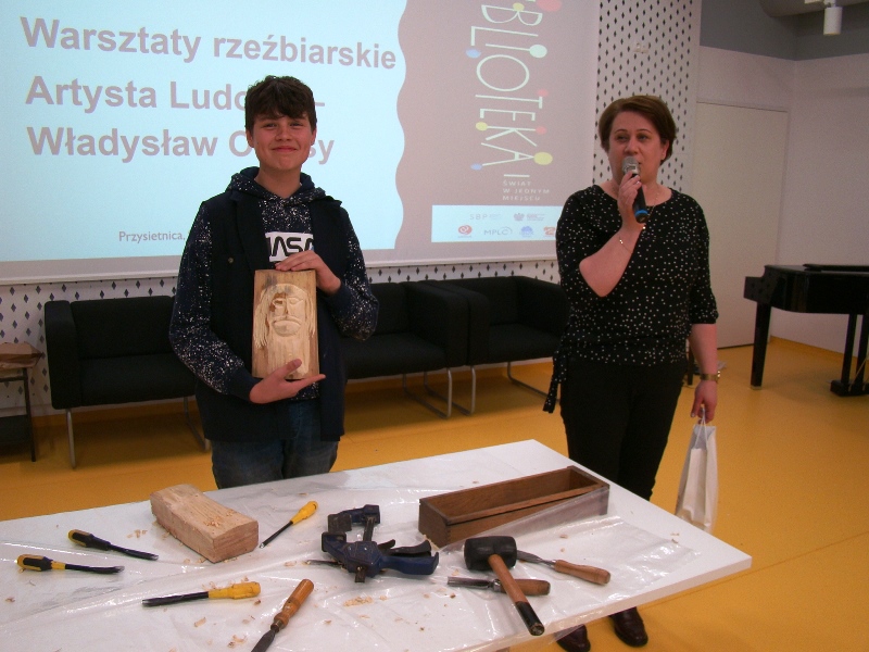 W drugiej części spotkania wszyscy chętni – a było ich wielu – mieli okazję wziąć dłuto do ręki i pod okiem fachowca postawić pierwsze rzeźbiarskie kroki. Okazało się, że posługiwanie się różnego rodzaju narzędziami rzeźbiarskimi nie jest takie proste, wymaga doświadczenia i wprawy, ale niektórzy zachęceni pochwałami artysty coraz pewniej prowadzili dłuta. W efekcie kilkuminutowej działalności wielu rąk oraz pomocy Pana Władysława, z kawałka drewna powstał zarys rzeźby.