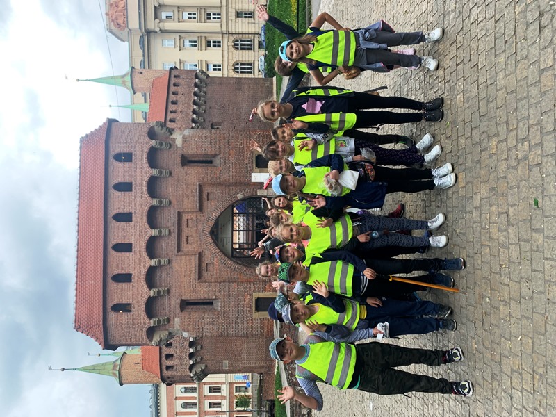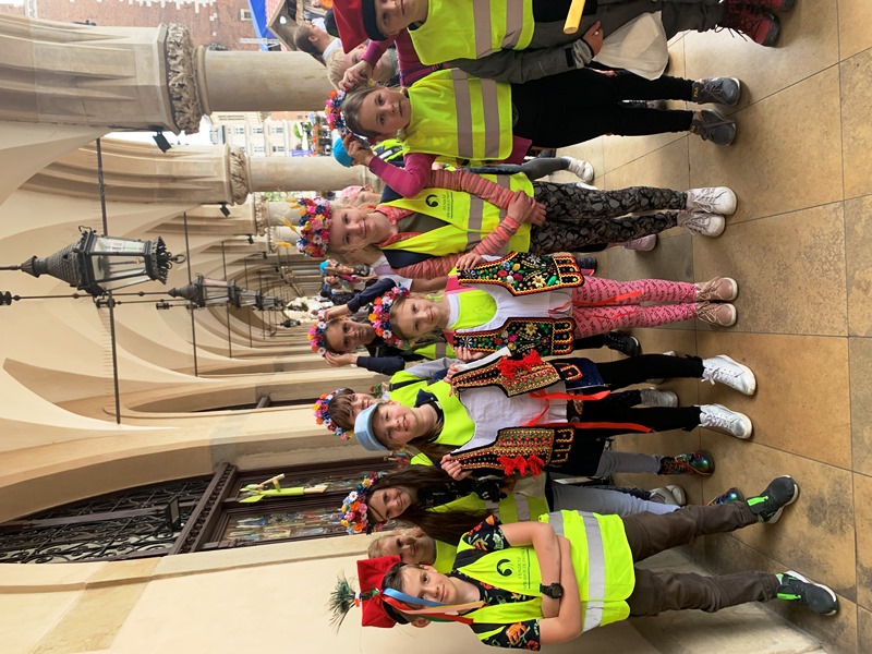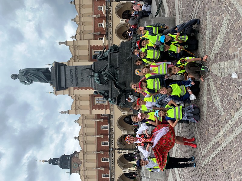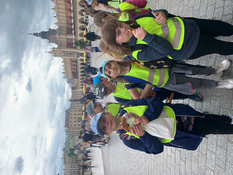 Po smacznym śniadaniu w ZOO nastąpił kolejny punkt zwiedzania – Krakowski Rynek. Tam dzieci poznały legendy i historię miasta opowiadaną przez przewodnika. Podziwiały Ołtarz Wita Stwosza w Kościele Mariackim, kupowały pamiątki w średniowiecznej galerii, w  Sukiennicach. Wysłuchały hejnału, pomachały trębaczowi, który również im się miło odwzajemnił. Degustowały krakowskie obwarzanki, pozowały z uroczą krakowianką przy pomniku Adama Mickiewicza i rzeźbie „Eros Spętany” Igora Mitoraja. Krakowska handlarka zrobiła dzieciom ogromną niespodziankę. Wystroiła ich w elementy narodowego stroju krakowskiego. Oprócz sztandarowych zabytków Krakowa uczniowie mogli zobaczyć turystów różnych narodowości oraz mieszkańców przemieszczających się po mieście dorożkami lub nowoczesnymi segway, hulajnogami, tramwajami.