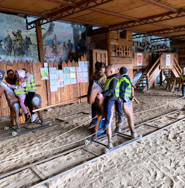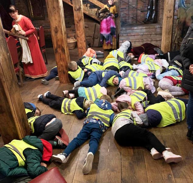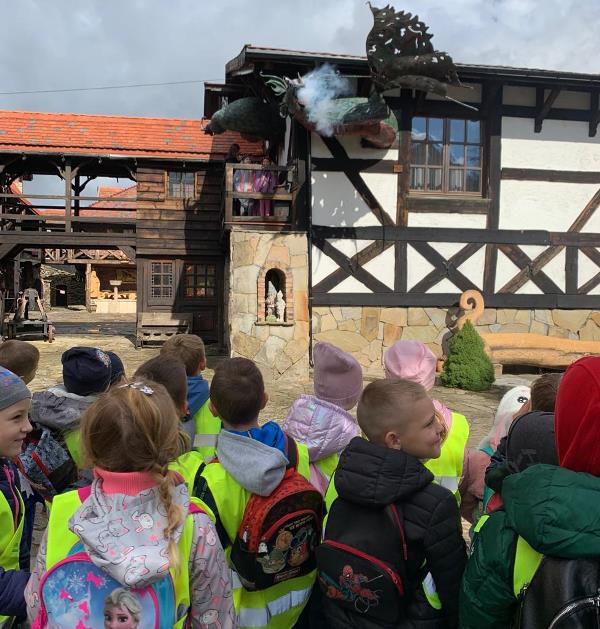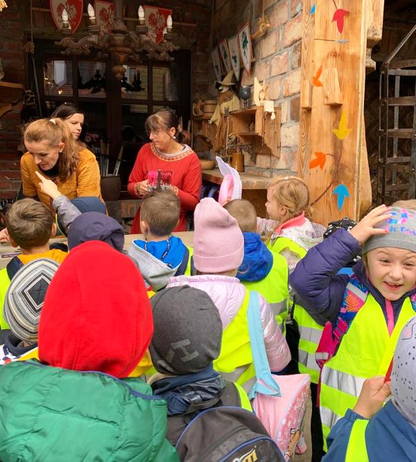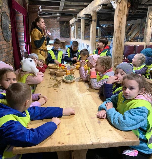 Na miejscu grupę przywitały damy dworu, które przybliżyły dzieciom odległą dla nich epokę średniowiecza. Uczniowie z zapartym tchem słuchali pradawnych legend, dowiedzieli się co to jest rekonstrukcja budowli oraz jak wyglądały zwyczaje ludzi mieszkających w starodawnych czasach. Następnie posilili się własnoręcznie wykonanymi i upieczonymi podpłomykami. Później odwiedzili wiele zakamarków zamku, a z każdym z nich związana była magiczna historia. W trakcie zwiedzania uczniowie szukali smoków, a przy pomocy rekwizytów i strojów wcielali się w różne postaci. Brali również udział w różnego rodzaju grach i zabawach średniowiecznych. Na koniec magicznym zaklęciem dzieci obudziły Smoka Grybosa, który w efektowny, a zarazem zatrważający sposób zionął ogniem.