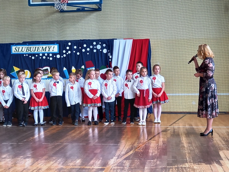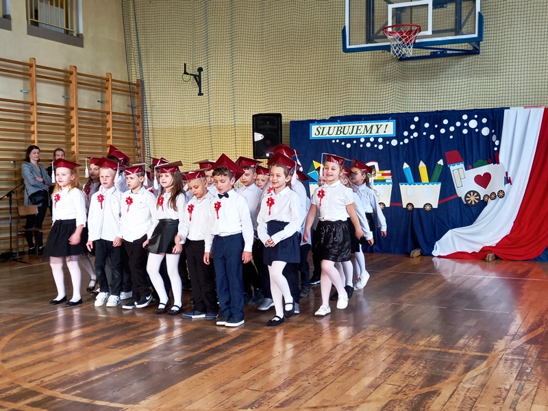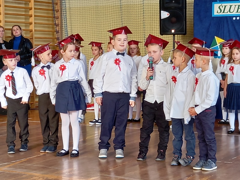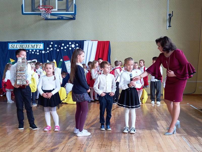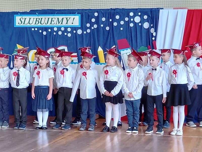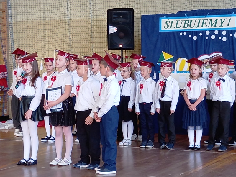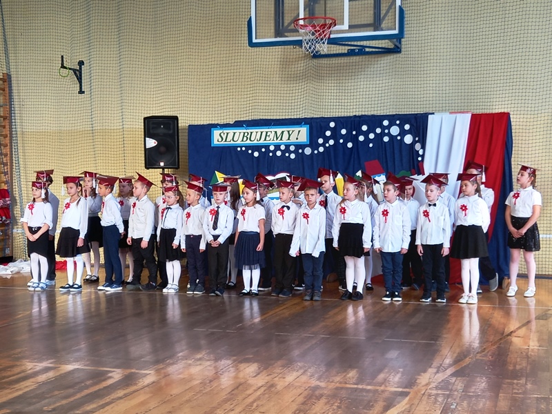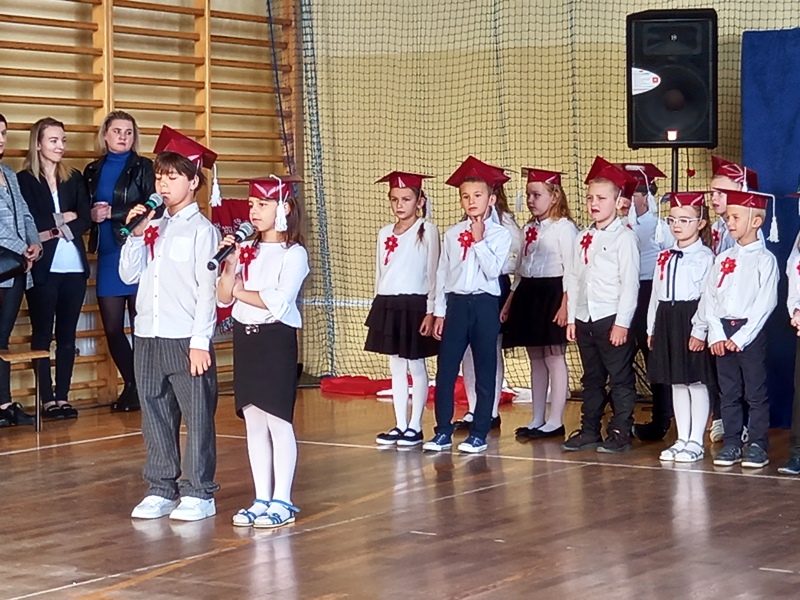 Uroczystość rozpoczęła się występem artystycznym, przygotowanym pod kierunkiem wychowawczyni - pani Aliny Citak. Pierwszacy błysnęli talentem. Wykazali się imponującą wiedzą o swojej małej i dużej Ojczyźnie, doskonale zdali test z różnych dziedzin wiedzy. Pięknie zaśpiewali piosenki, wystąpił także duet polsko-ukraiński, w którym dzieci udowodniły, że przyjaźń i koleżeństwo jest możliwe mimo utrudnień językowych. Taniec z flagą wywołał u oglądających duże wzruszenie. Później dzieci z honorem złożyły ślubowanie na Sztandar Szkoły. Było to duże przeżycie dla wszystkich obecnych. Po ślubowaniu, pan dyrektor Aleksander Łukasik uroczyście pasował uczniów symbolicznym ołówkiem. Wychowawczyni wręczyła pierwszoklasistom pamiątkowe dyplomy pasowania na ucznia. Na koniec akademii dzieci w barwnych strojach zatańczyły rytmiczną „Belgijkę”.