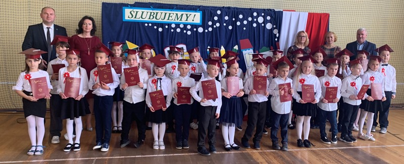W dalszej części uroczystości gratulacje i życzenia złożył dzieciom pan dyrektor, a pani wicedyrektor Anna Golonka przekazała  pierwszakom wyposażone plecaki, do życzeń dołączył się  przewodniczący Rady Rodziców pan Jan Tokarczyk. Dzieci otrzymały również obfite kuferki ufundowane przez rodziców, a także słodycze od pani Sołtys. Przedstawiciele najmłodszej Grupy Wiekowej oraz Samorządu  Uczniowskiego złożyli życzenia i wręczyli upominki, które wywołały radość i promienny uśmiech na twarzach bohaterów uroczystości. Akademia zakończyła się pamiątkowym, grupowym zdjęciem oraz sesją indywidualną przy pięknej dekoracji wykonanej przez rodziców. Na koniec rozentuzjazmowani pierwszoklasiści udali się na smaczny poczęstunek przygotowany przez rodziców.