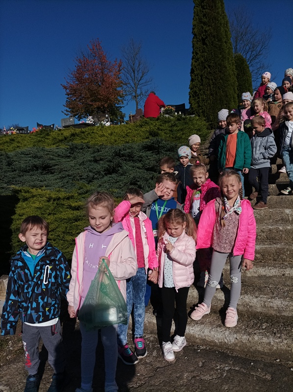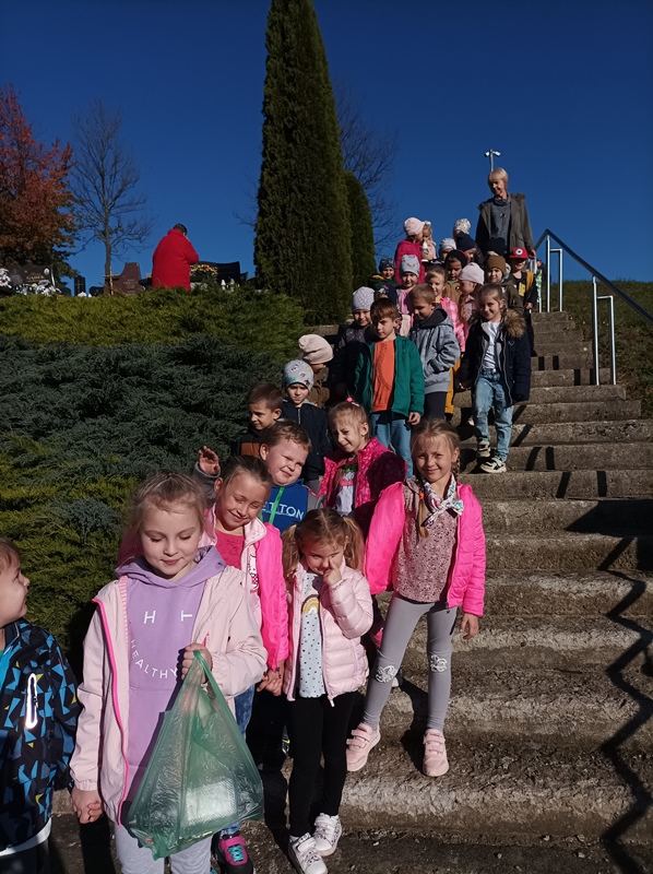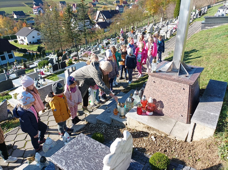 Koniec października to czas, kiedy przedszkolaki z oddziałów 0-1 i 0-2 jak co roku składają wizytę na cmentarzu parafialnym. Spacer był dla dzieci ogromnym przeżyciem, szły skupione i bardzo spokojne. Doskonale wiedziały, jak należy się zachowywać w takim miejscu. Pod krzyżem zmówiły krótką modlitwę za zmarłych i zapaliły znicze. Był to dla nich szczególny czas zadumy i pamięci. W drodze powrotnej wspominały swoich bliskich, tych których już z nami nie ma.
