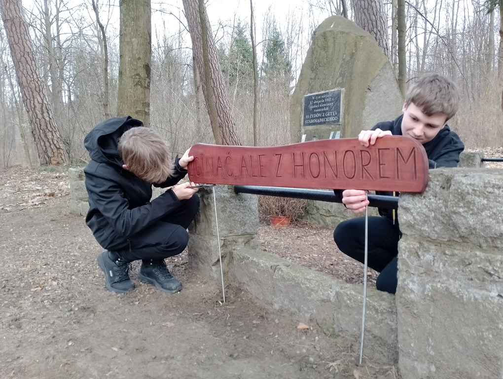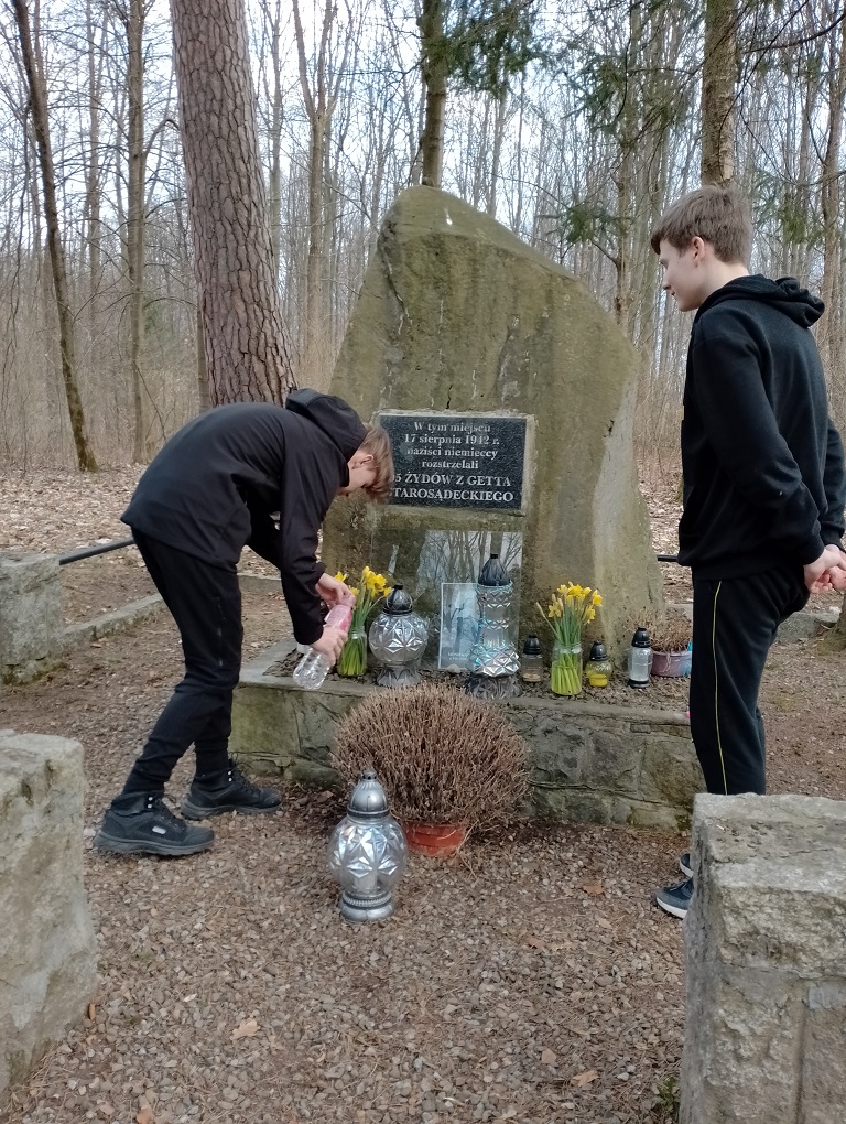 Uczniowie klasy 8 Szkoły Podstawowej w Przysietnicy Dawid Weselak i Paweł Lorek, biorący udział w projekcie Sejm Dzieci i Młodzieży, którego tegoroczny temat brzmi: Zginąć, ale z honorem (Krystyna Budnicka). Bohaterska walka zbrojna żydowskich organizacji bojowych z Niemcami z perspektywy 80 lat – o ludzki, społeczny i narodowy honor oraz godność, na przykładzie powstania w getcie warszawskim , postanowili uczcić pamięć starosądeckich Żydów, którzy zostali rozstrzelani, ponieważ nie mieli siły dojść do Nowego Sącza. Przy pomniku na Piaskach, chłopcy posprzątali plac koło pomnika, zamontowali własnoręcznie zrobioną tablicę upamiętniającą wszystkich rozstrzelanych oraz złożyli kwiaty, mając nadzieje że przekażą tym gestem młodemu pokoleniu iż „ historia żyje w narodzie, dopóki naród o niej pamięta”