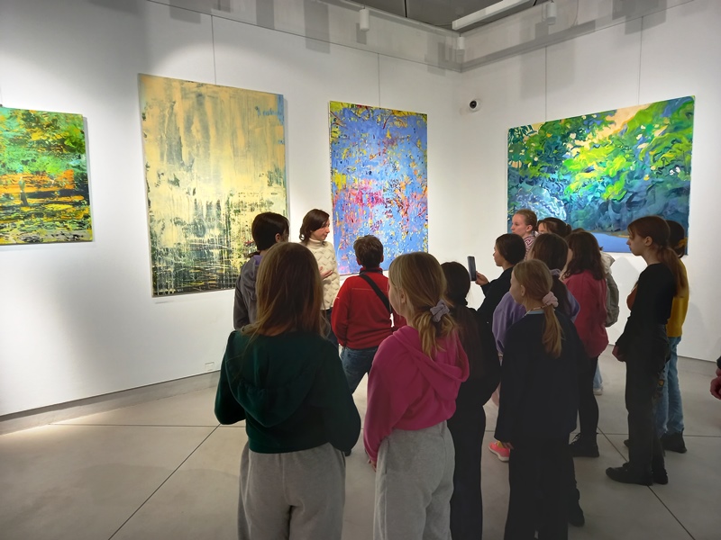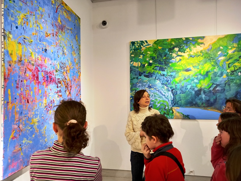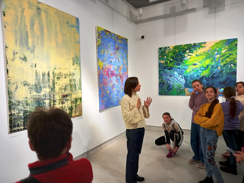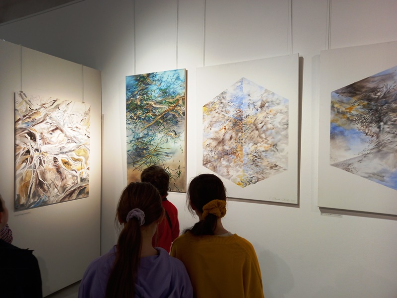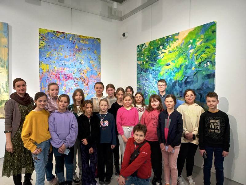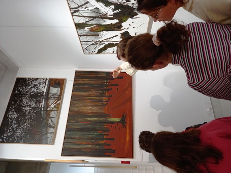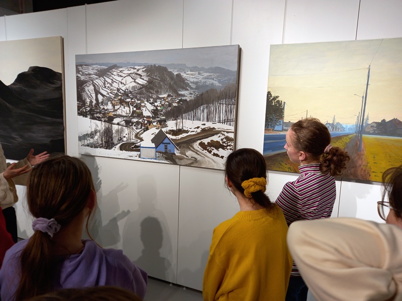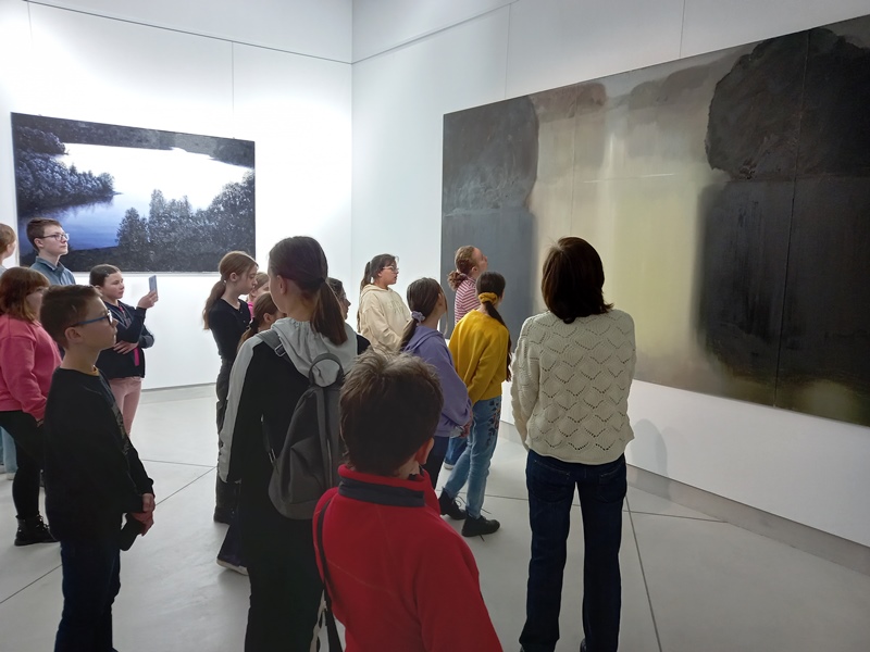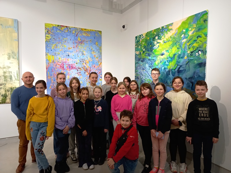 Już sama przestrzeń galerii, sposób ekspozycji dzieł, ich rozmiary i światło – wszystko to wywarło na nas ogromne wrażenie. Po galerii oprowadzała nas p. dr Agnieszka Tes – kuratorka i kierownik artystyczna wystawy. Przy każdym obrazie podpowiadała na co zwrócić uwagę, pomagała rozpoznać różnorodne sposoby artystycznej ekspresji. Dla większości uczniów była to pierwsza w życiu wizyta w galerii malarstwa, gdzie mogli z bliska zobaczyć i niemal dotknąć wielkoformatowe autentyczne obrazy, które wyszły spod ręki różnych artystów prezentujących odmienne techniki i nurty w sztuce – i tak, poprowadzeni zostaliśmy poprzez realizm, ku zupełnie abstrakcyjnym formom. Wizyta ta była wyjątkową lekcją plastyki, która być może stanie się inspiracją dla własnych twórczych poszukiwań.