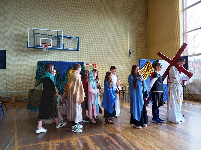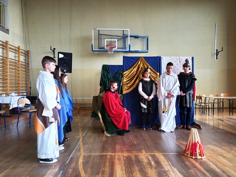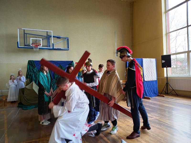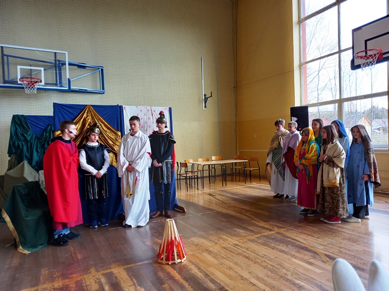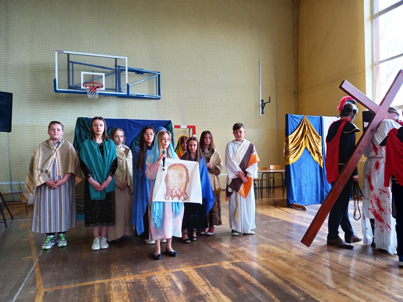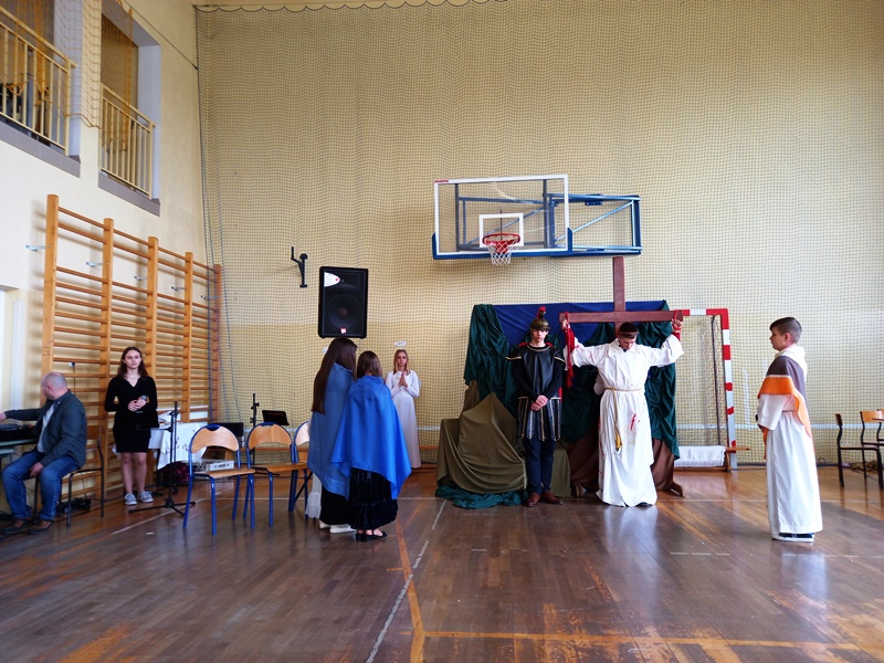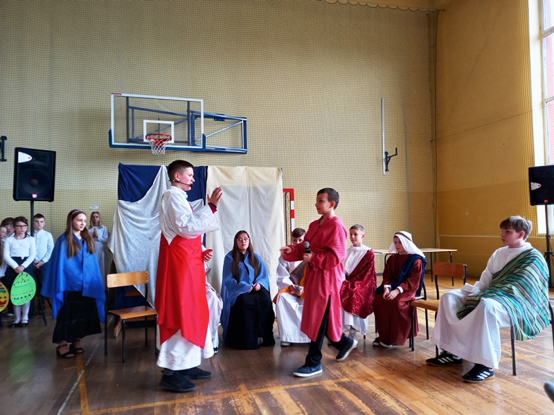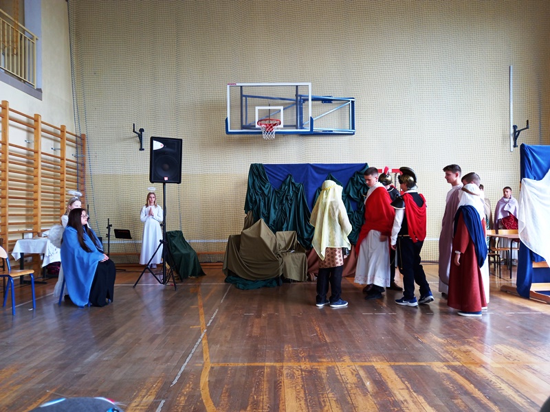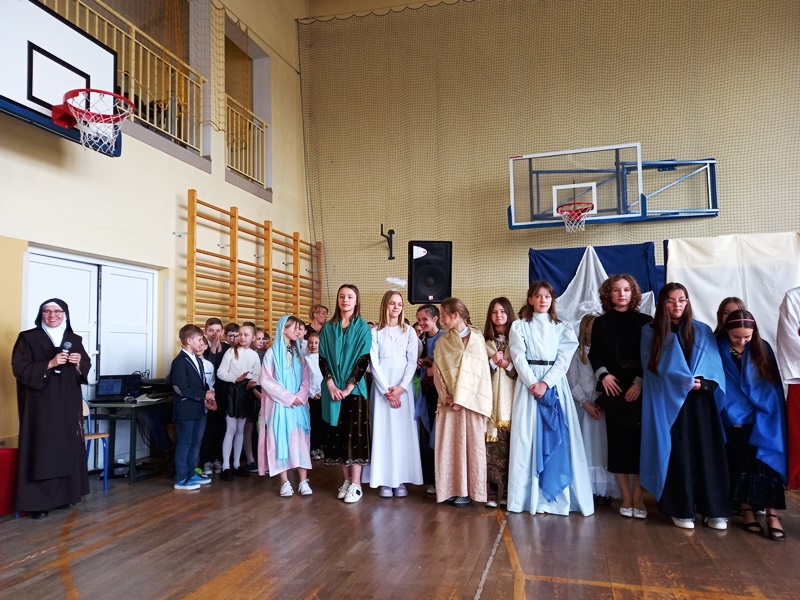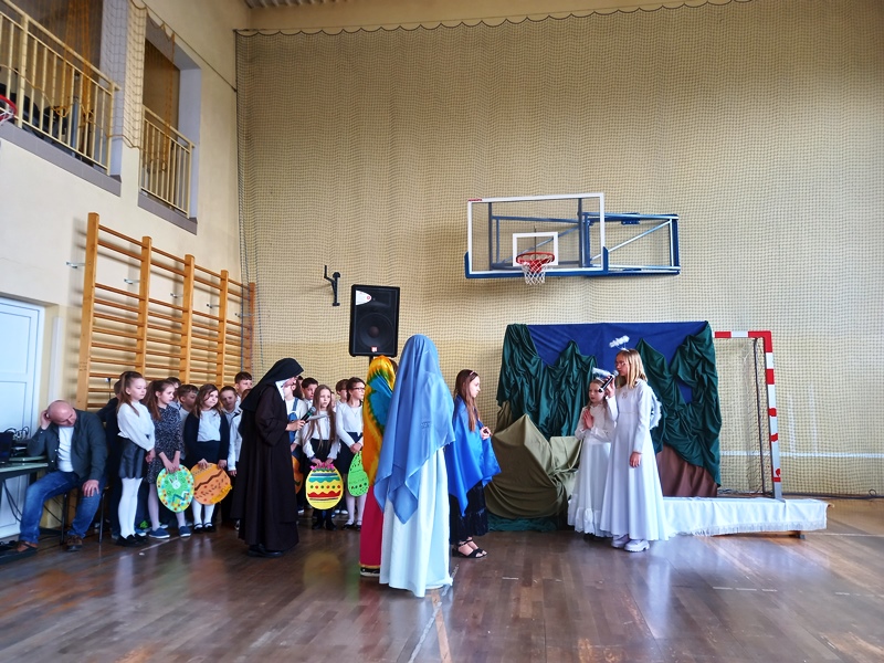 W środę, 5 kwietnia, cała społeczność szkolna zgromadziła się na sali gimnastycznej, by zobaczyć Misterium Wielkanocne pt. „Ja jestem z wami, przez wszystkie dni, aż do skończenia świata.” W przedstawieniu, przygotowanym przez s. Rachelę, brali udział uczniowie klas IV, V, VII, VIII a i VIII b. Dekoracje, stroje, muzyka, śpiew uczniów kl. III i Gabrysi Radomskiej z kl. VIII b, a przede wszystkim zaangażowanie uczniów w przedstawienie swoich ról, sprawiły, że oglądający uczniowie mogli się niejako przenieść w czasy Jezusa i przeżyć wydarzenia z Ostatniej Wieczerzy oraz Męki, Śmierci i Zmartwychwstania Jezusa Chrystusa. W czasie przedstawienia uczniowie mogli zobaczyć dodatkowe sceny, których nie ma w Ewangelii, a które ukazywały rolę Maryi współcierpiącej ze swoim Synem, Współodkupicielki ludzi. Zostały one zaczerpnięte z objawień Matki Bożej błogosławionej Katarzynie Emmerich. Po zakończeniu inscenizacji dzieci klas przedszkolnych w kolorowych przebraniach zaprezentowały taniec do piosenki „Kolorowe pisanki”, którą zaśpiewali uczniowie kl. III. Na koniec pan Dyrektor wystąpił z życzeniami świątecznymi.