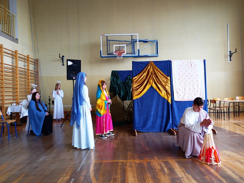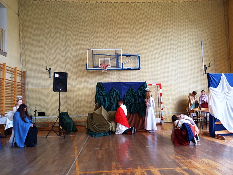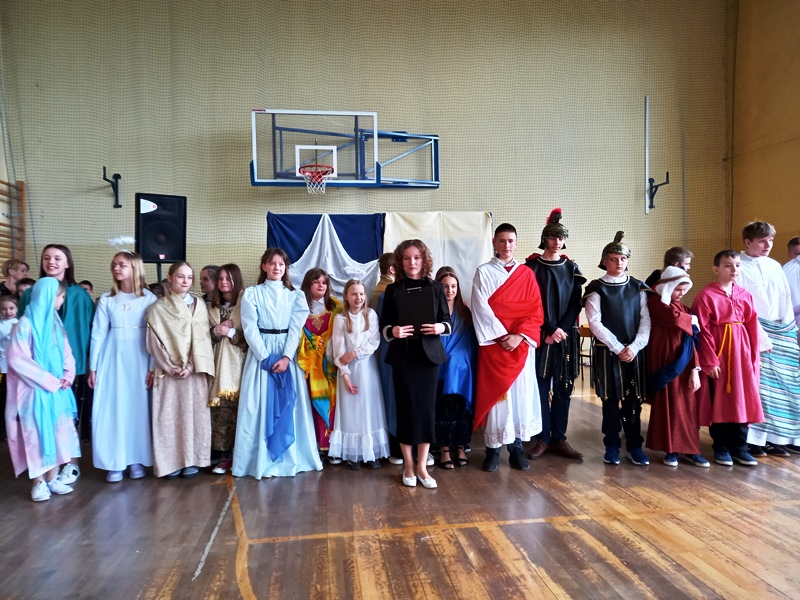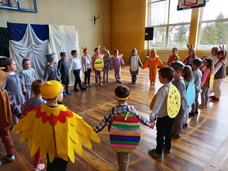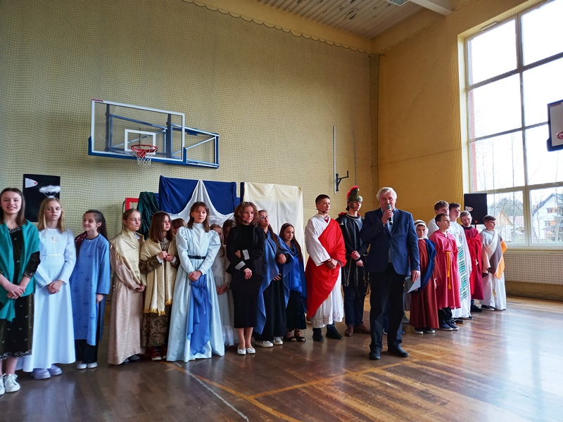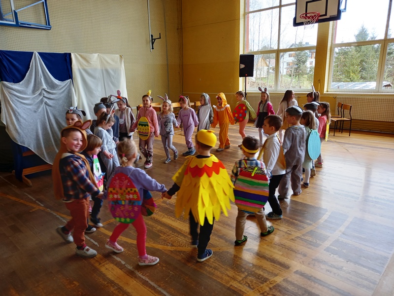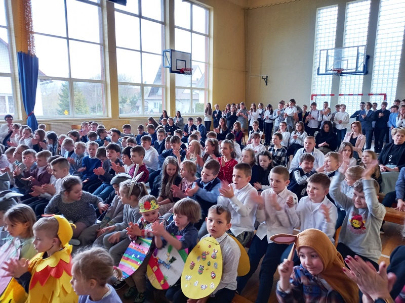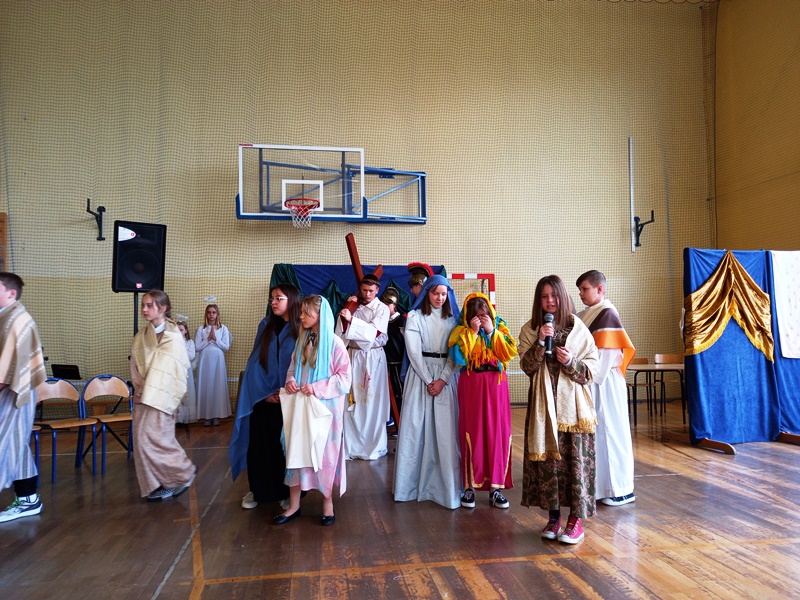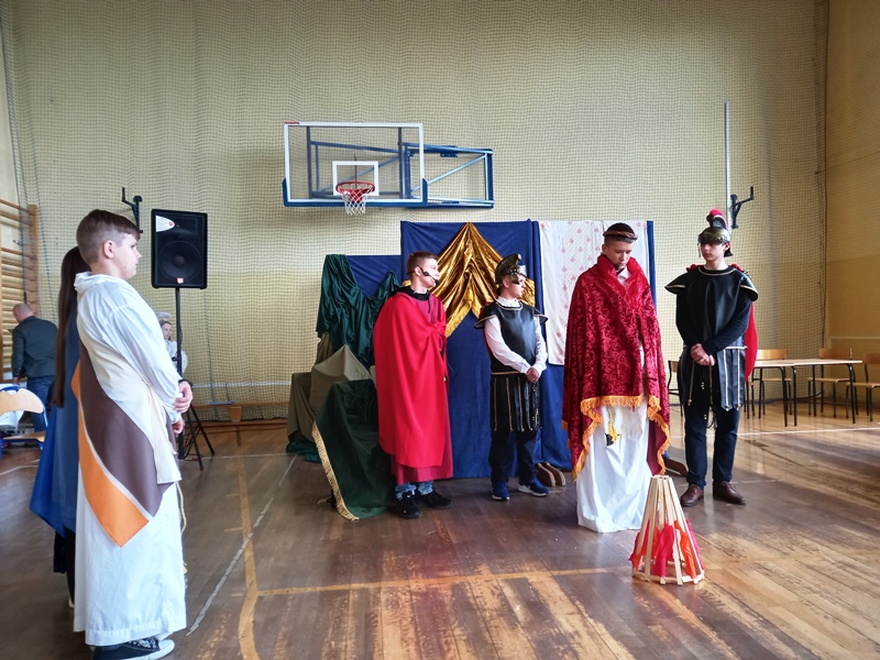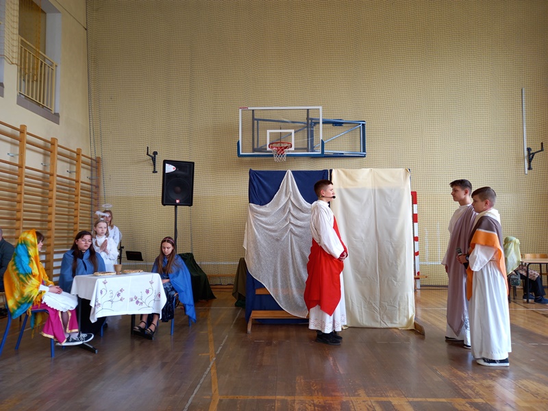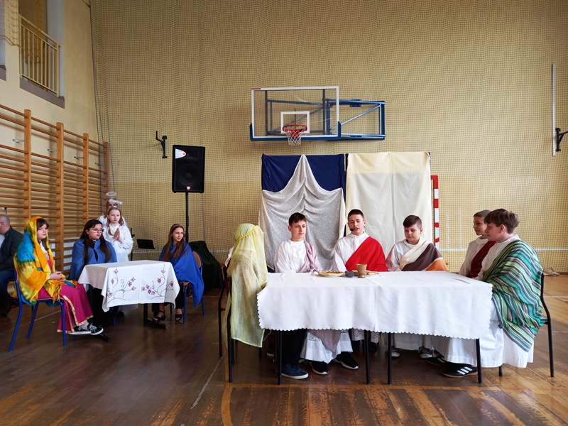 W środę, 5 kwietnia, cała społeczność szkolna zgromadziła się na sali gimnastycznej, by zobaczyć Misterium Wielkanocne pt. „Ja jestem z wami, przez wszystkie dni, aż do skończenia świata.” W przedstawieniu, przygotowanym przez s. Rachelę, brali udział uczniowie klas IV, V, VII, VIII a i VIII b. Dekoracje, stroje, muzyka, śpiew uczniów kl. III i Gabrysi Radomskiej z kl. VIII b, a przede wszystkim zaangażowanie uczniów w przedstawienie swoich ról, sprawiły, że oglądający uczniowie mogli się niejako przenieść w czasy Jezusa i przeżyć wydarzenia z Ostatniej Wieczerzy oraz Męki, Śmierci i Zmartwychwstania Jezusa Chrystusa. W czasie przedstawienia uczniowie mogli zobaczyć dodatkowe sceny, których nie ma w Ewangelii, a które ukazywały rolę Maryi współcierpiącej ze swoim Synem, Współodkupicielki ludzi. Zostały one zaczerpnięte z objawień Matki Bożej błogosławionej Katarzynie Emmerich. Po zakończeniu inscenizacji dzieci klas przedszkolnych w kolorowych przebraniach zaprezentowały taniec do piosenki „Kolorowe pisanki”, którą zaśpiewali uczniowie kl. III. Na koniec pan Dyrektor wystąpił z życzeniami świątecznymi.