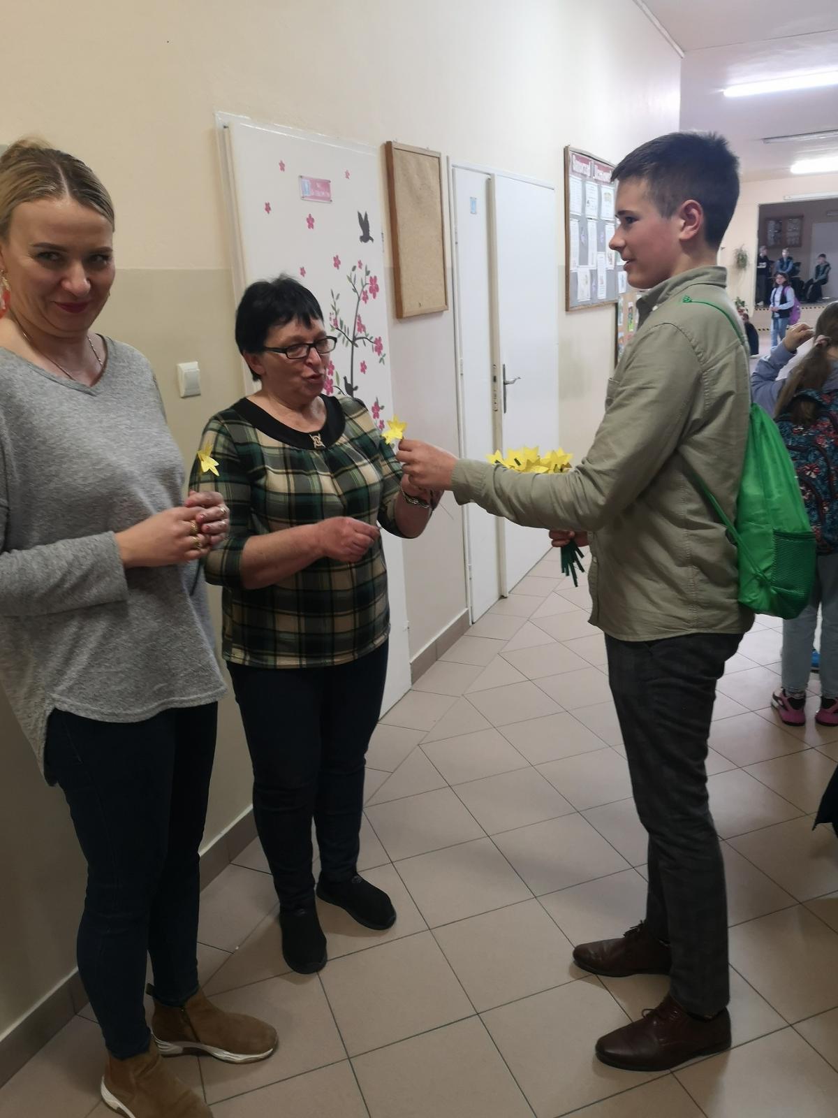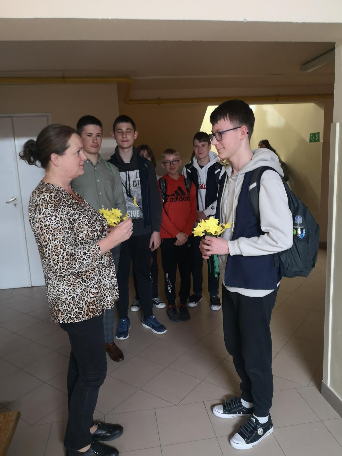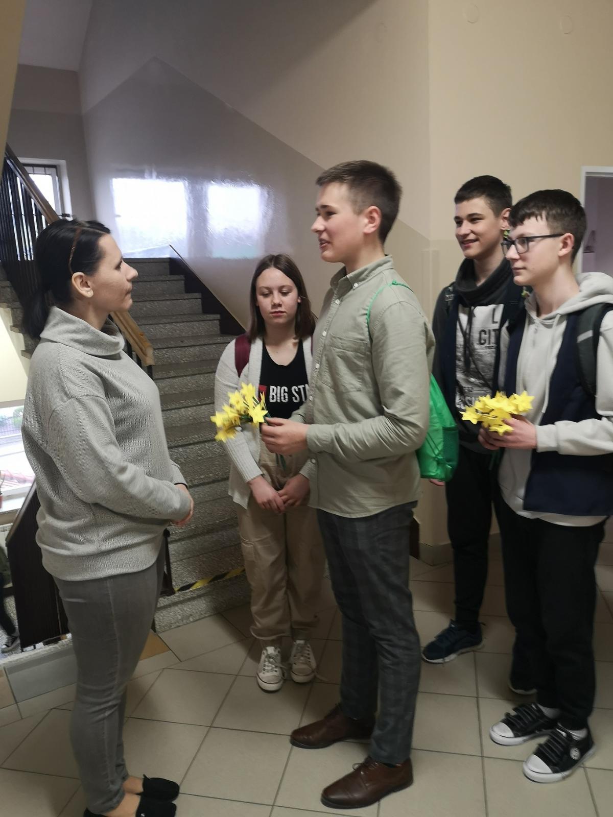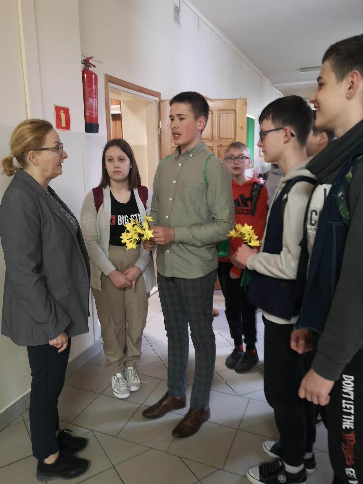 19 kwietnia 2023r. uczniowie klas ósmych wraz z wychowawcami wzięli udział w XI edycji akcji społeczno- edukacyjnej Żonkile . Młodzież wykonała papierowe kwiaty żonkili, które symbolizują ludność żydowską zamkniętą w gettcie warszawskim w 1941r. i rozdała je społeczności szkolnej. Przypięty żonkil 19 kwietnia oznacza, że w rocznicę wybuchu powstania w gettcie warszawskim Łączy Nas Pamięć o ważnych dla historii Polski wydarzeniach.. W ramach lekcji wychowawczych uczniowie obejrzeli animowaną wersję książki Hanny Krall „Zdążyć przed Panem Bogiem” i zapoznali się z materiałami edukacyjnymi przekazanymi przez Muzeum Polin.