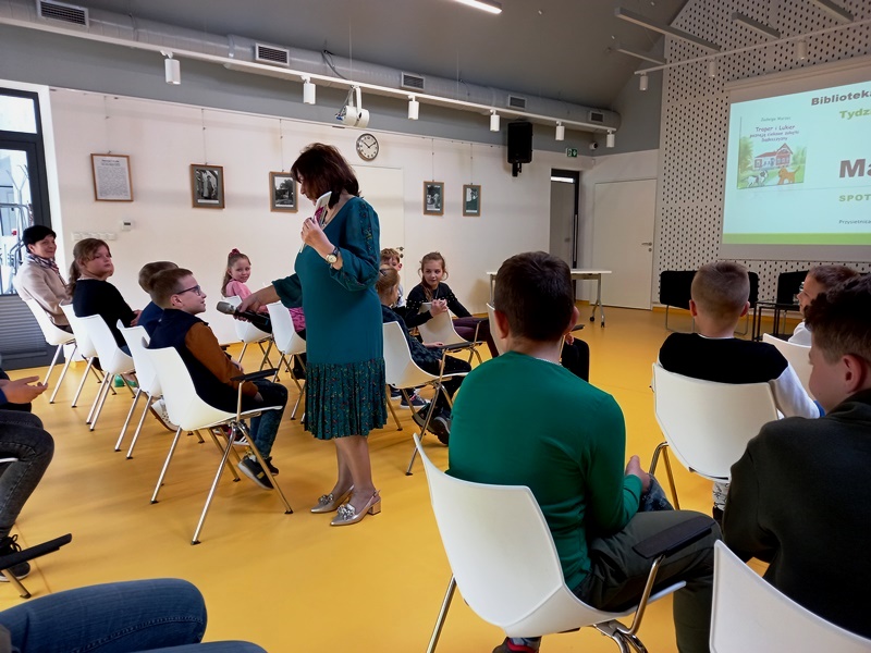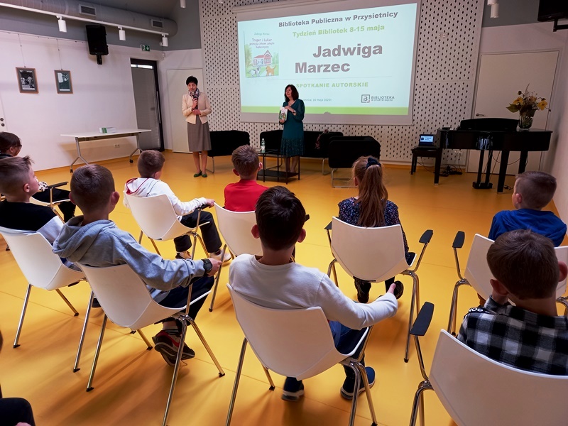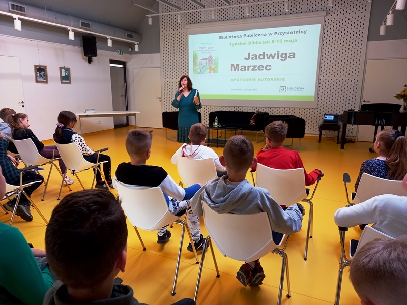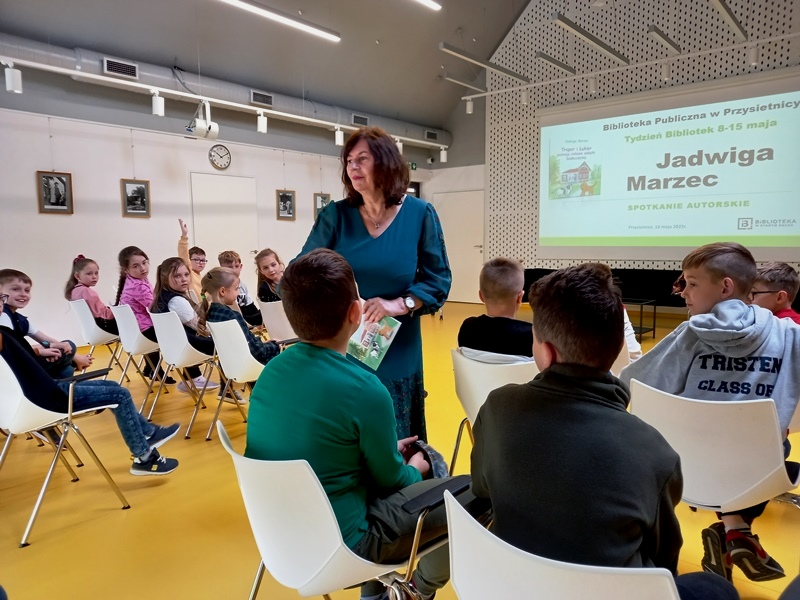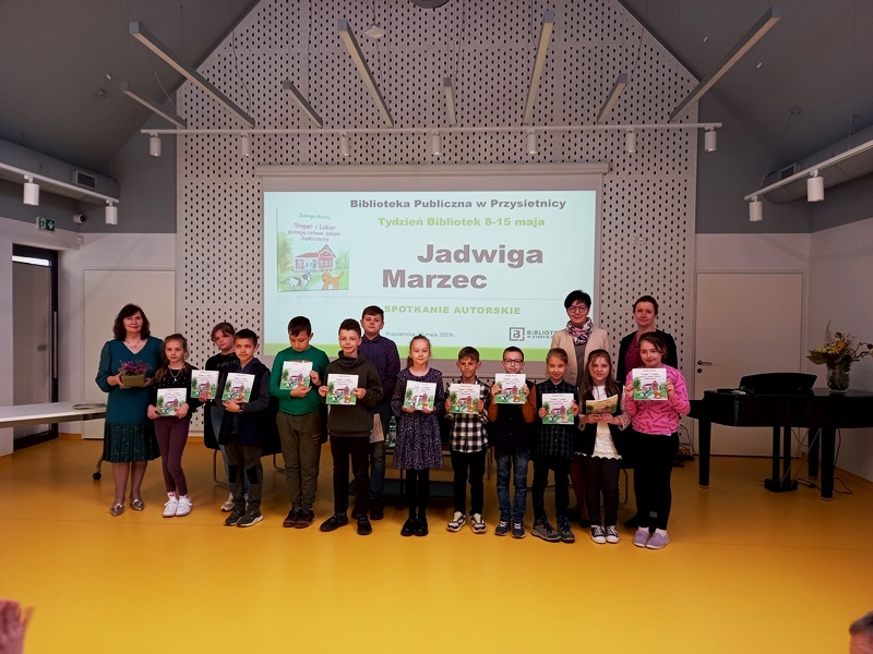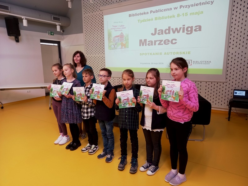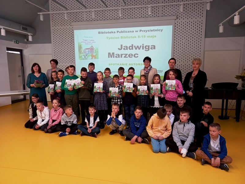 W ramach obchodów „Tygodnia Bibliotek” Biblioteka Publiczna w Przysietnicy zaprosiła uczniów klasy trzeciej wraz z innymi uczestnikami konkursu literacko-plastycznego „Poszukiwacze przygód Traper i Lukier odkrywają kolejne atrakcje Sądecczyzny” na spotkanie autorskie z p. Jadwigą Marzec. Było to kolejne już spotkanie z autorką, podczas którego Pani Jadwiga opowiadała zgromadzonym o tym, jak powstają jej książki, do których ilustracje tworzą dzieci. Zachęcała uczniów do czytania i rozwijania swojej wyobraźni i twórczości.