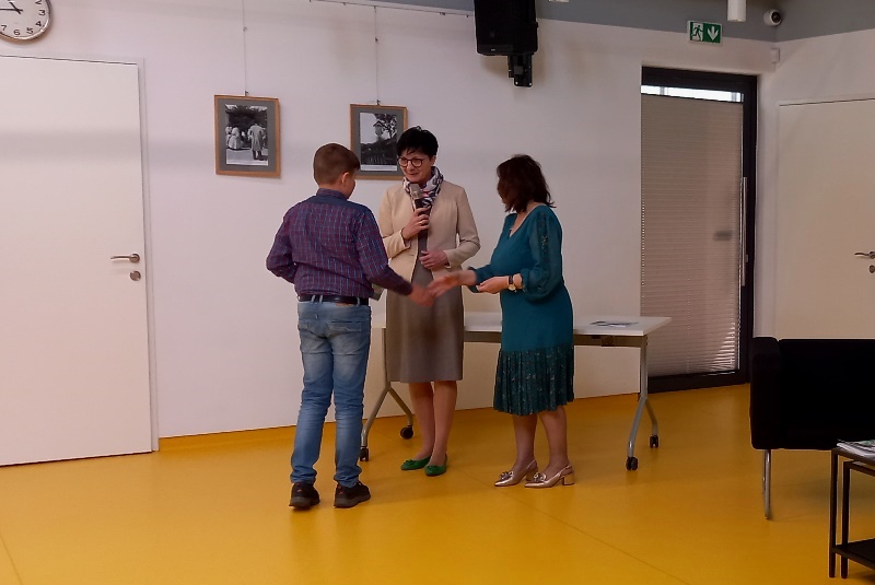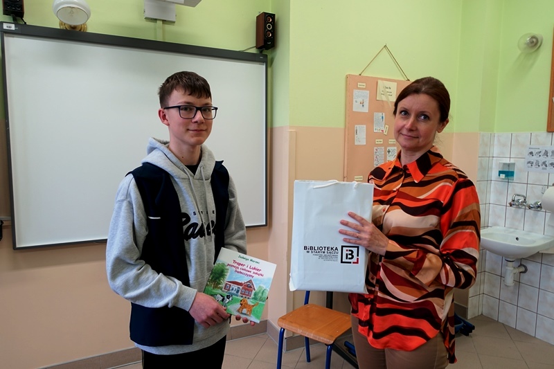 Warto przypomnieć, że w drugim konkursie literacko-plastycznym – podobnie jak w pierwszym – uczestniczyło wielu uczniów z naszej szkoły, a ich prace plastyczne zdobią kartki kolejnej książki o przygodach dwóch piesków, które zachęcają czytelników do odwiedzania atrakcyjnych zakątków Sądecczyzny. Spotkanie z pisarką stało się okazją do obdarowania wszystkich uczestników konkursu książką z autografem. Wraz z autorką nagrody wręczała uczniom Dyrektor Powiatowej i Miejsko-Gminnej Biblioteki Publicznej w Starym Sączu p. Monika Jackowicz-Nowak. Szczególne wyrazy uznania otrzymał Konrad Lorek, jako „główny ilustrator”, który swoje nagrody odebrał w szkole przekazane przez nauczyciela bibliotekarza.