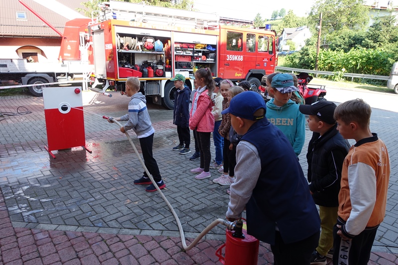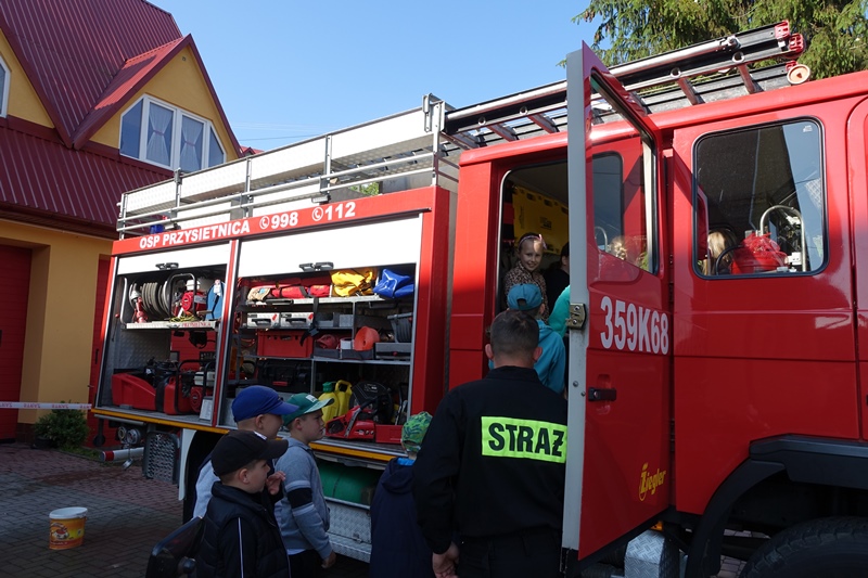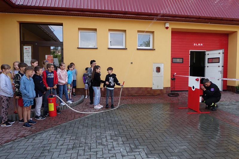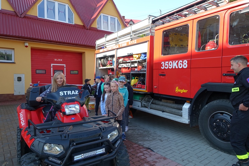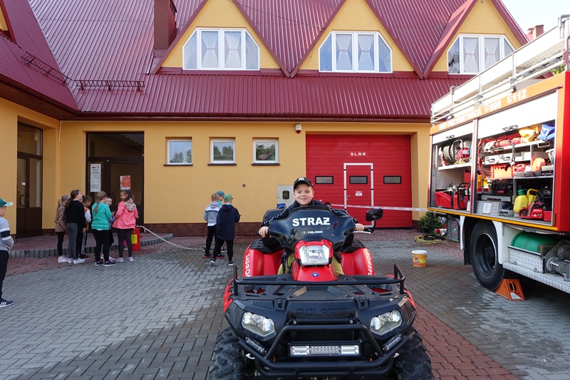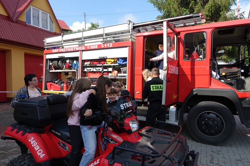 W czwartek 15 czerwca dzieci z klas 0-III uczestniczyły w spotkaniu ze strażakami Ochotniczej Straży Pożarnej w Przysietnicy. Dzięki życzliwości strażaków, nasi podopieczni uzyskali mnóstwo informacji na temat pracy strażaka. Poznali umundurowanie, a także sprzęt niezbędny podczas wykonywanej służby. Każde dziecko mogło przymierzyć hełm i elementy stroju oraz zrobić sobie pamiątkowe zdjęcie. Uczniowie dowiedzieli się również, jak należy zachować się podczas pożaru i innych zagrożeń oraz do jakich zdarzeń należy wzywać straż pożarną. Przedszkolaki dobrze wiedzą, że strażacy nie tylko gaszą pożary, ale pomagają też w wielu innych niebezpiecznych sytuacjach. Podczas pogadanki utrwaliły sobie numery alarmowe służb ratowniczych. Najwięcej jednak emocji wzbudził quad oraz wóz strażacki. Dzieci mogły z bliska podziwiać wyposażenie pojazdu. Ogromną frajdę sprawiło dzieciakom lanie wody z węża oraz możliwość wejścia do wozu strażackiego.
