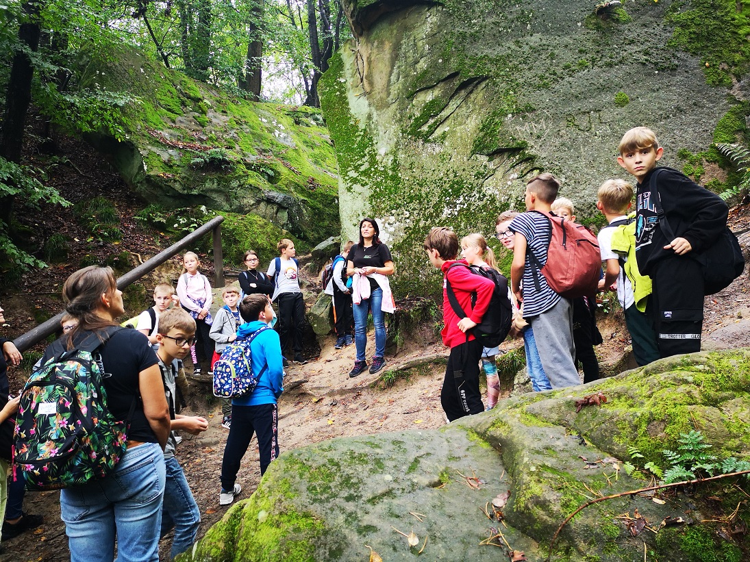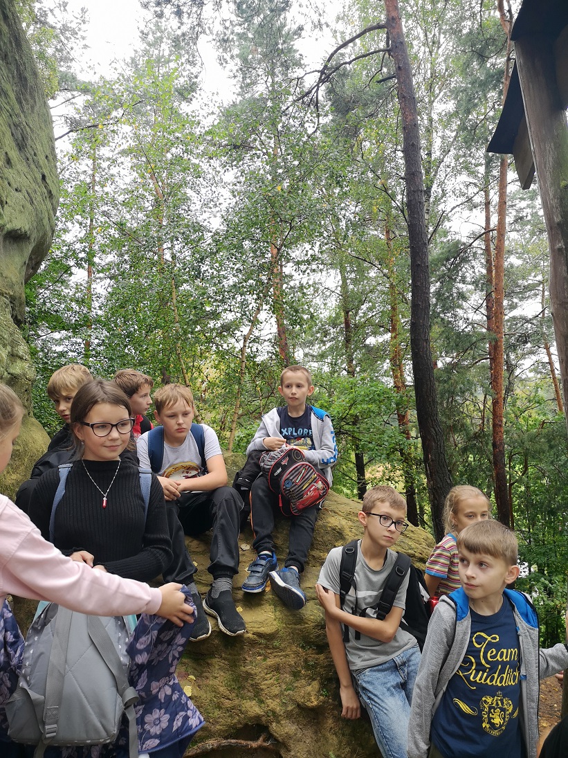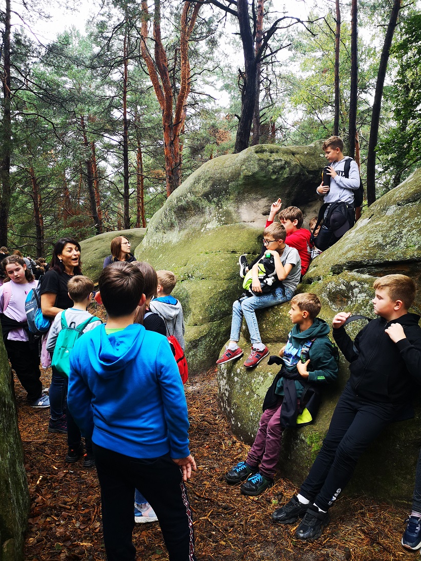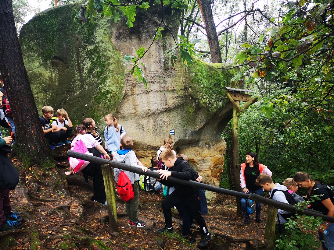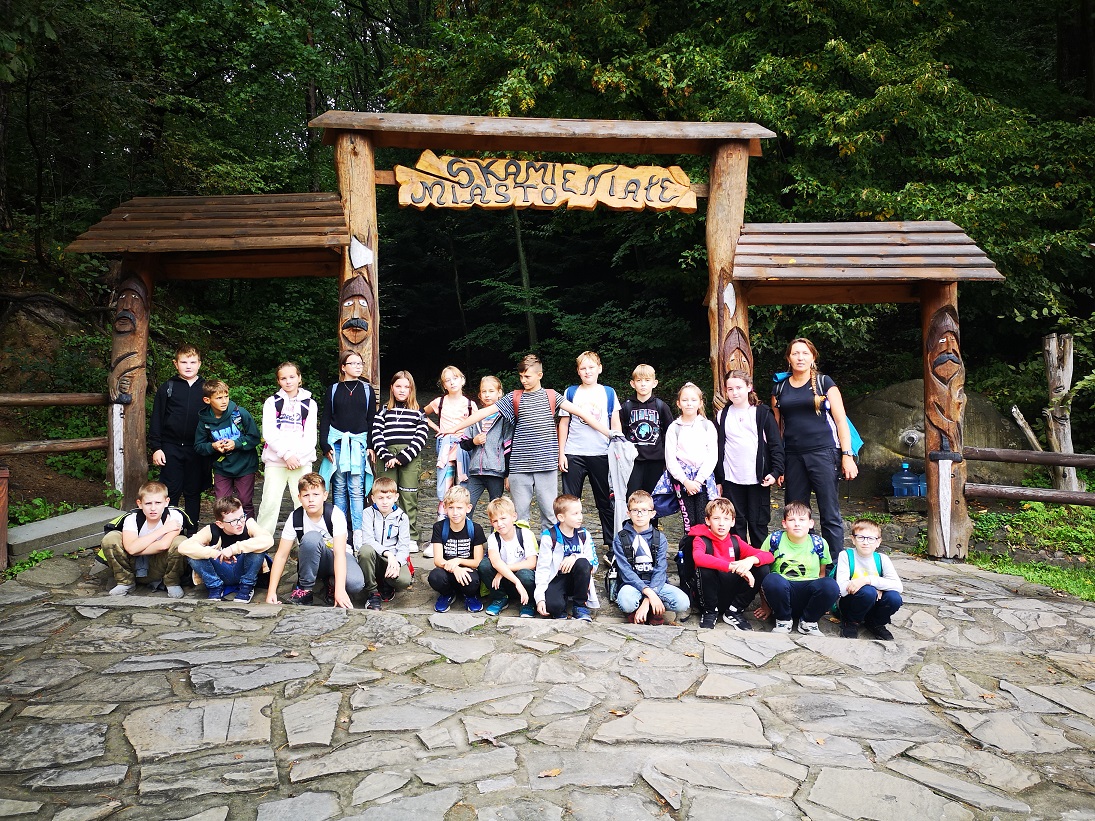 25 września 2023r. klasa IV wzięła udział w wycieczce klasowej do Ciężkowic. Pierwszym punktem wyjazdu były warsztaty w Małopolskim Centrum Edukacji Przyrodniczej, w którym uczniowie mieli okazję doświadczalnie poznać niektóre zjawiska przyrodnicze związane z żywiołami. Sprawdzano możliwości wykorzystania powietrza i wody oraz budowę Ziemi. Pani przewodnik bardzo obrazowo przedstawiła znaczenia działalności człowieka na przyrodę i otaczający nas świat. Szczególną atrakcją były zadania dotyczące nietoperzy i ich zdolności echolokacyjnych. Po wspólnej nauce wszyscy udali się na wędrówkę po Skamieniałym Mieście. W czasie marszu było wiele okazji do zapoznania się z legendami i ciekawostkami niezwykłych formacji skalnych na trasie. Kilkukrotnie można było sprawdzić swoją odwagę przeciskając się przez wąskie szczeliny i jaskinie. Liczne atrakcje i niespodziewane kształty skał bardzo wszystkich zaciekawił. Żywiołowość i energia czwartoklasistów okazała się ogromna. Bez trudu pokonali całą, kilkugodzinną trasę oraz wszyscy uczestniczyli w proponowanych im wyzwaniach fizycznych. Wycieczka była bardzo udana i już planujemy kolejne wyprawy.