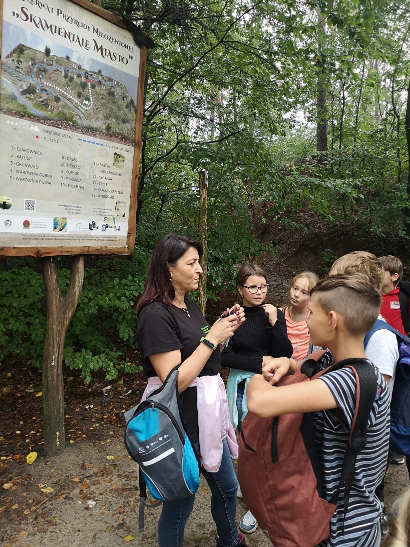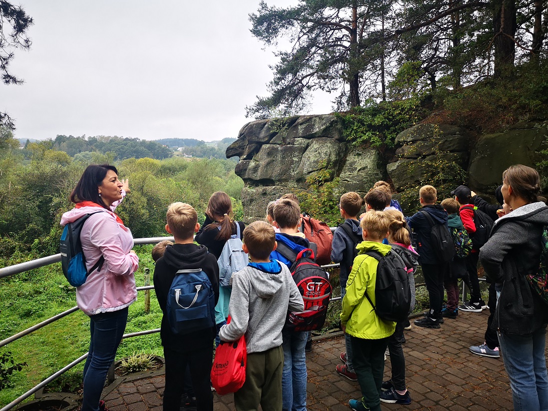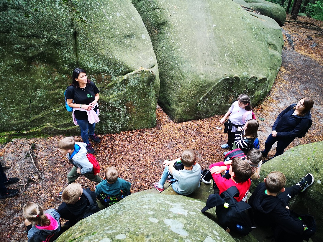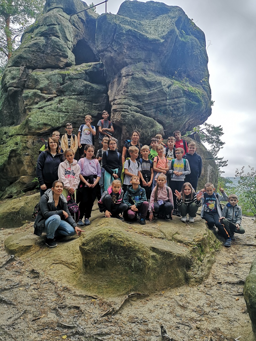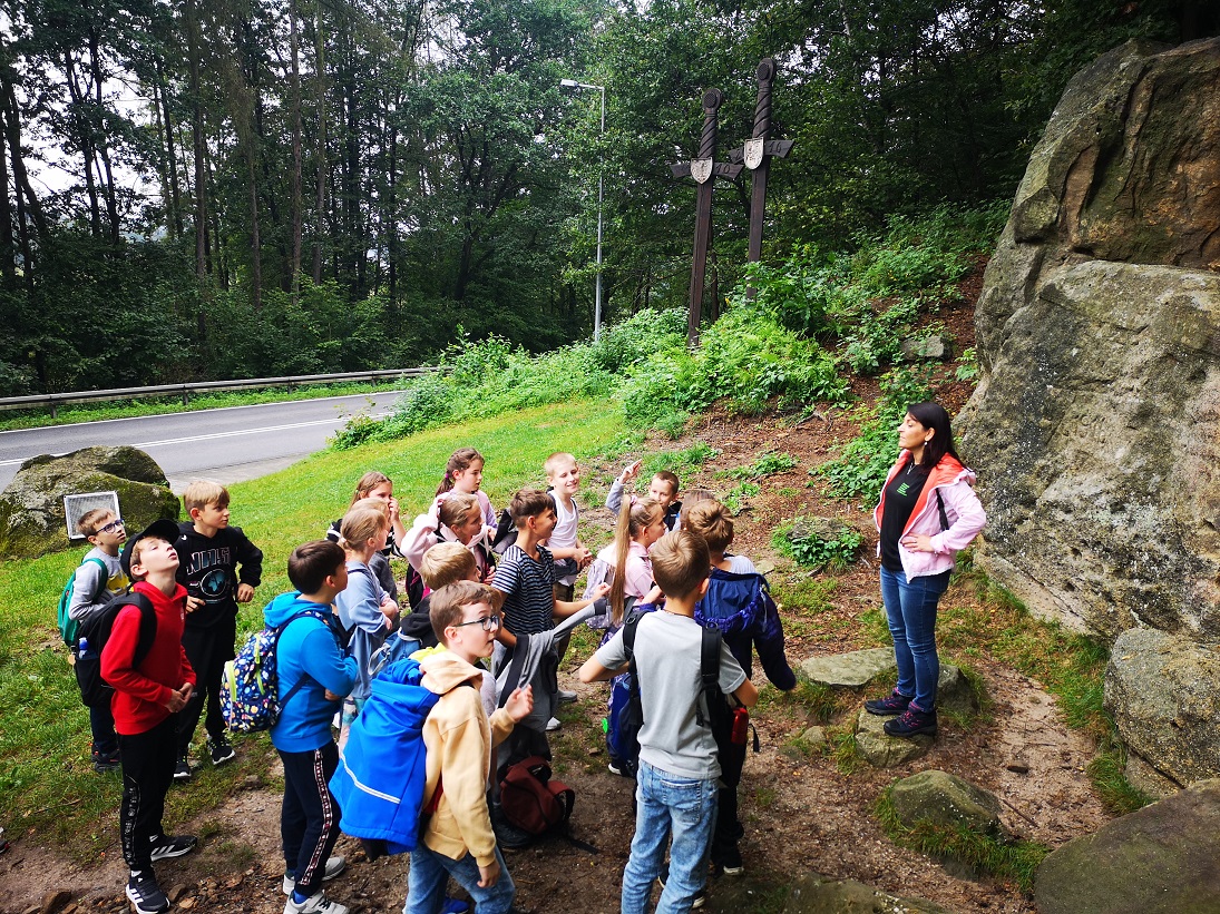 25 września 2023r. klasa IV wzięła udział w wycieczce klasowej do Ciężkowic. Pierwszym punktem wyjazdu były warsztaty w Małopolskim Centrum Edukacji Przyrodniczej, w którym uczniowie mieli okazję doświadczalnie poznać niektóre zjawiska przyrodnicze związane z żywiołami. Sprawdzano możliwości wykorzystania powietrza i wody oraz budowę Ziemi. Pani przewodnik bardzo obrazowo przedstawiła znaczenia działalności człowieka na przyrodę i otaczający nas świat. Szczególną atrakcją były zadania dotyczące nietoperzy i ich zdolności echolokacyjnych. Po wspólnej nauce wszyscy udali się na wędrówkę po Skamieniałym Mieście. W czasie marszu było wiele okazji do zapoznania się z legendami i ciekawostkami niezwykłych formacji skalnych na trasie. Kilkukrotnie można było sprawdzić swoją odwagę przeciskając się przez wąskie szczeliny i jaskinie. Liczne atrakcje i niespodziewane kształty skał bardzo wszystkich zaciekawił. Żywiołowość i energia czwartoklasistów okazała się ogromna. Bez trudu pokonali całą, kilkugodzinną trasę oraz wszyscy uczestniczyli w proponowanych im wyzwaniach fizycznych. Wycieczka była bardzo udana i już planujemy kolejne wyprawy.