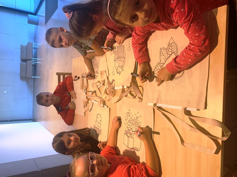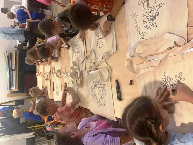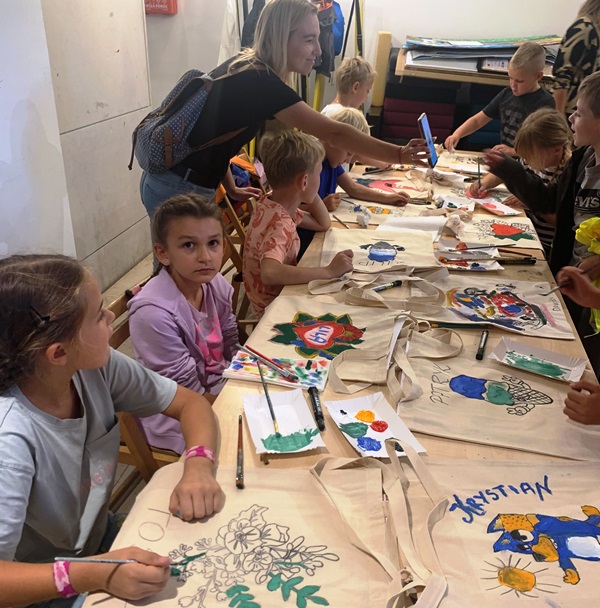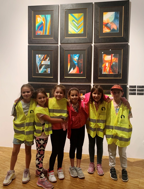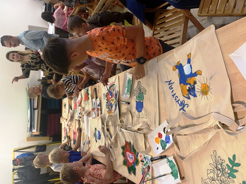 Tam przywitał dzieci pan Marcin, który przygotował zajęcia. Wytłumaczył kolejne etapy powstawania ich dzieła – ozdobionej własnoręcznie lnianej torby. Każdy z uczestników wybrał sobie wzór lub sam go zaprojektował. Z wielką starannością i troską o każdy szczegół artyści przystąpili do malowania. Mieszając kolory, tworzyli barwy pochodne, by ich torba była wyjątkowa i niepowtarzalna. Po pracy pełnej emocji i wysiłku poszli zwiedzać wystawę, która mieściła się na I i II piętrze. Pracownik Galerii przybliżył uczniom technikę, jaką wykorzystał w swoich pracach ich autor, pan Zygmunt Stenwak.