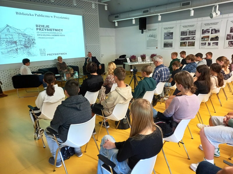3 października 2023r. klasy VII i VIII zostały zaproszone do Biblioteki Publicznej na promocję książki „Dzieje Przysietnicy – od czasów najdawniejszych”. W spotkaniu uczestniczyła młodzież naszej szkoły oraz zaproszeni goście – mieszkańcy Przysietnicy wraz z p. sołtys Bożeną Ogorzały i wicedyrektorem szkoły p. Anną Golonka. Wydarzenie uświetniła swoją obecnością dyrektor Powiatowej i Miejsko-Gminnej Biblioteki Publicznej w Starym Sączu p. Monika Jackowicz-Nowak, która była moderatorem rozmowy z autorami publikacji - p. Zofią Golonka i p. Kazimierzem Gizickim.