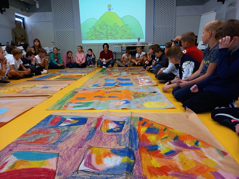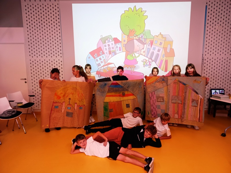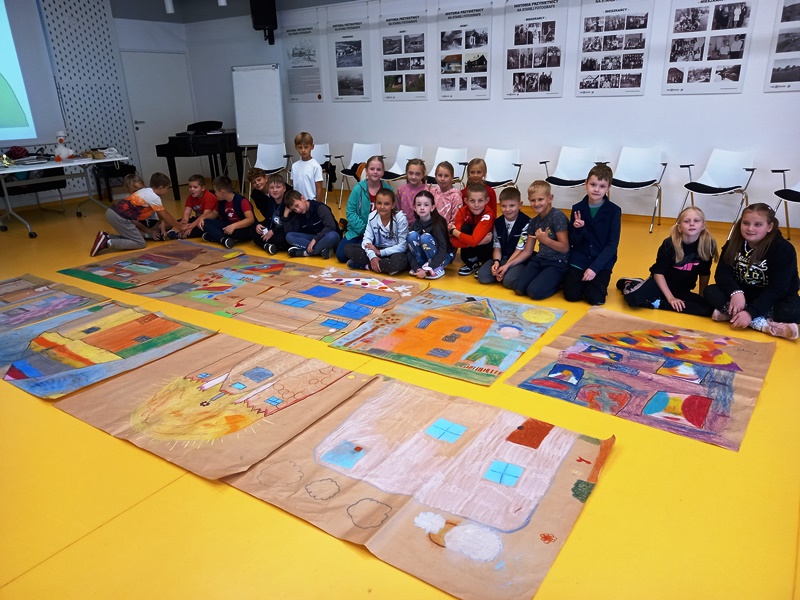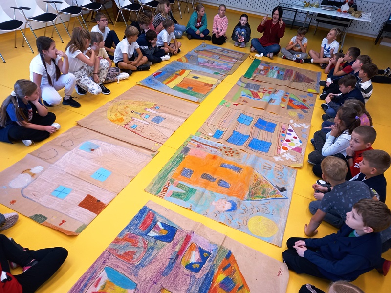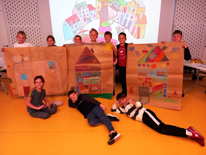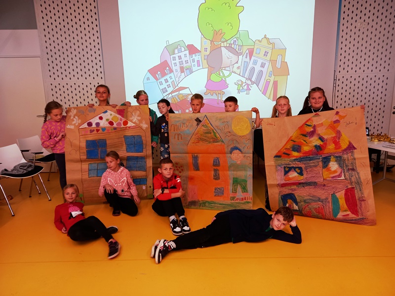 To było wyjątkowe spotkanie – pani Joanna nie tylko opowiadała nam o swojej twórczości, ale także zaangażowała wszystkich do wspólnej aktywności: inscenizacji, zabawy ruchowej i twórczości plastycznej. Rozmawiała z dziećmi o powstawaniu książek, pomysłach na pisanie i dużo opowiadała o swoim dzieciństwie, kiedy to w małej dziewczynce budziła się pasja pisania. Nikt na tym spotkaniu nie miał czasu na nudę, wszyscy uważnie słuchali, bądź z zapałem wykonywali proponowane zadania. Na zakończenie odbyła się sesja zdjęciowa z prezentacją efektów wspólnej pracy – bajkowo kolorowych domków.