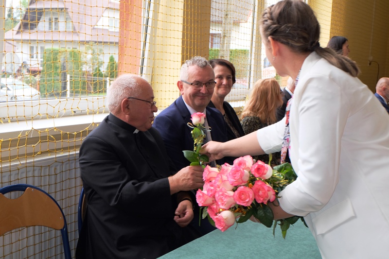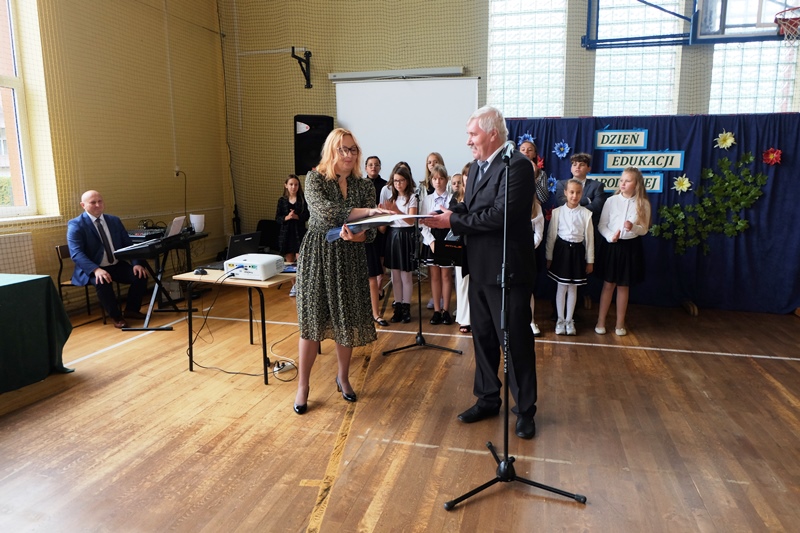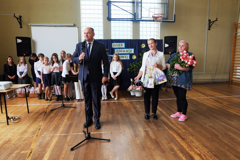 W kolejnej części uroczystości Pan Dyrektor Aleksander Łukasik podziękował nauczycielom za trud nauczania, za owocną współpracę i zaangażowanie wręczając nauczycielom i pracownikom szkoły nagrody dyrektora szkoły. Życzenia do nauczycieli skierował również pan burmistrz Kazimierz Gizicki oraz przedstawiciel Rady Rodziców p. Jan Tokarczyk, składając na ręce Pana Dyrektora Aleksandra Łukasika i Pani wicedyrektor Anny Golonki bukiety kwiatów.