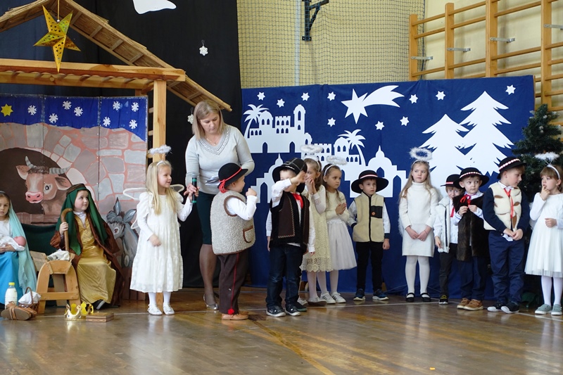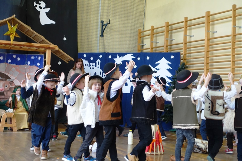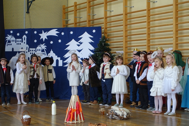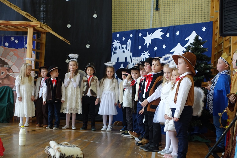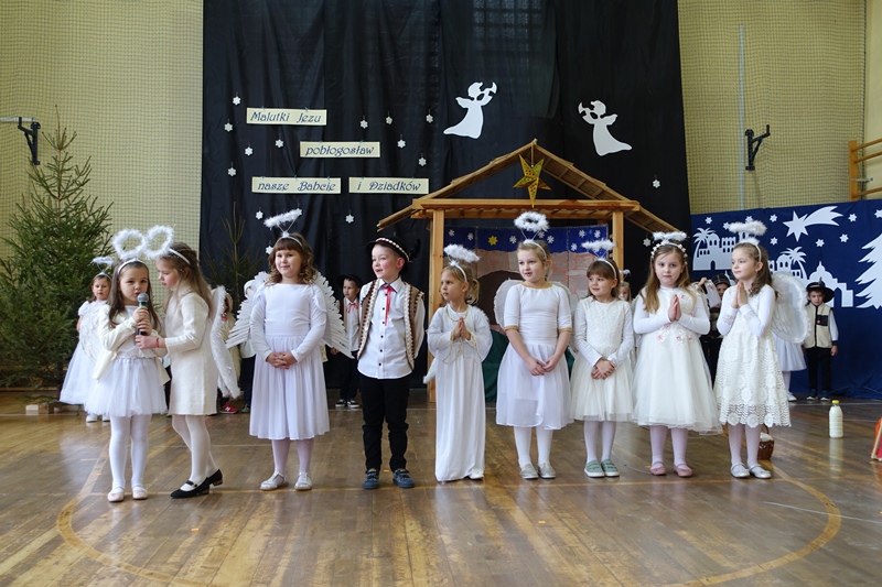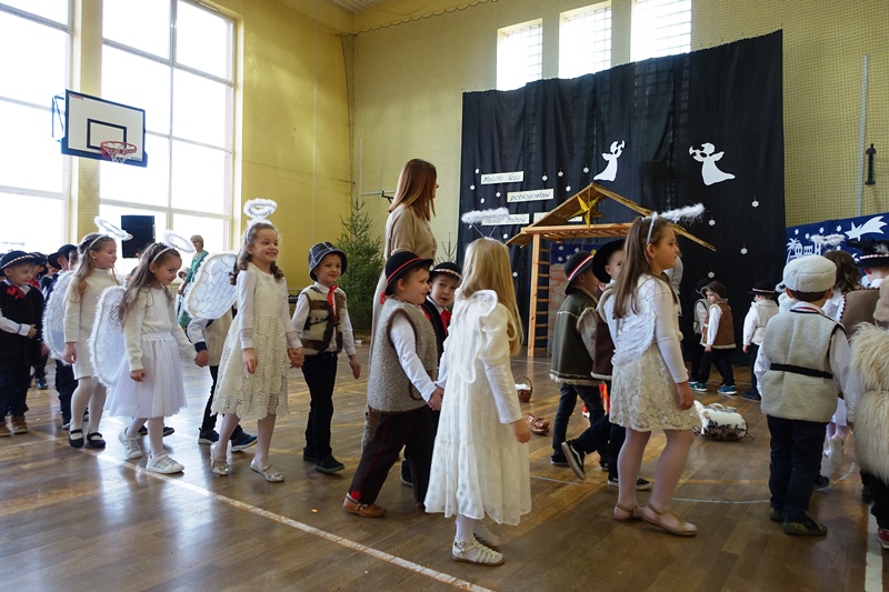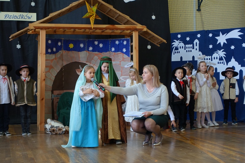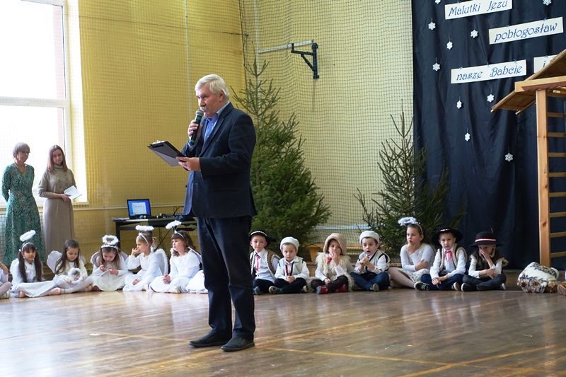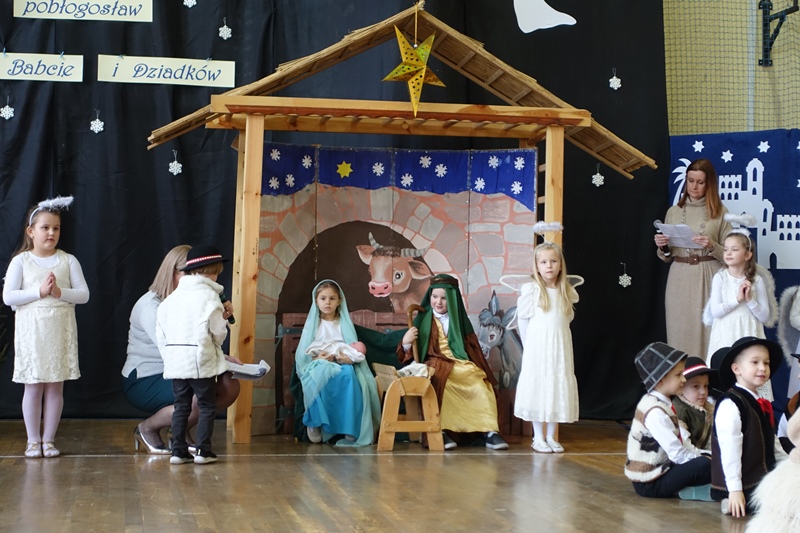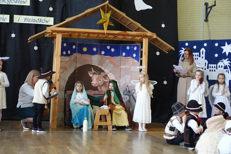 Tradycją naszej szkoły jest przygotowywanie Uroczystości z okazji Dnia Babci i Dziadka przez najmłodszych uczniów. W tym roku dzieci z oddziałów przedszkolnych 0-1 i 0-2 pod kierunkiem wychowawców i nauczycieli: p. Agnieszki, p. Alicji, p. Celinki i p. Renaty dla swoich Dziadków przygotowały przedstawienie jasełkowe. Nie zabrakło również poetyckich życzeń i piosenek oraz tańców dla naszych kochanych Bliskich. Mali artyści z przejęciem odtwarzali swoje role, a czcigodni goście ze wzruszeniem odbierali czułe słowa, które wnuczęta kierowały pod ich adresem. Po przedstawieniu życzenia zebranym Gościom złożył Dyrektor szkoły p. Aleksander Łukasik.