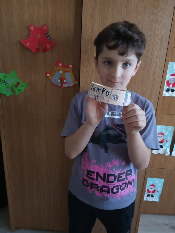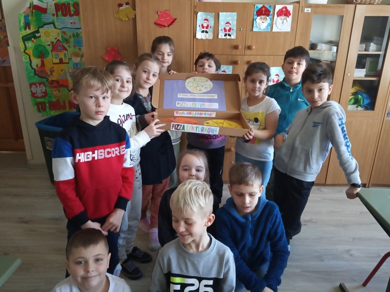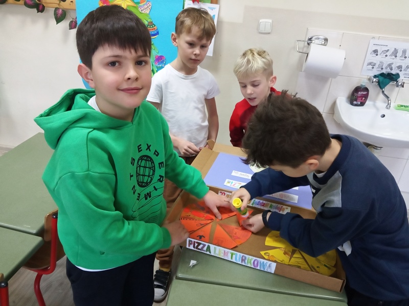 W ramach realizacji II modułu „Bądź dobry dla zwierząt” uczniowie klasy IIb czytali i omawiali lekturę „O psie, który jeździł koleją”. Najpierw w lekturnikach drugoklasiści uzupełnili metryczkę książki, narysowali portret głównego bohatera oraz wypisali jego cechy wyglądu i charakteru. Potem dokonali samooceny swojej pracy i poziomu znajomości treści lektury. Bardzo chętnie opowiadali o przygodach Lampo i dzielili się swoimi wrażeniami po przeczytaniu lektury. Następnie wykonali pizzę lekturową – na kawałkach pizzy narysowali kolejne przygody głównego bohatera. Zaprojektowali i wykonali również obrożę dla zwierzątka, na której umieścili elementy związane z lekturą. Ponadto uczestniczyli w wyjeździe do kina na film „O psie, który jeździł koleją” i dzięki temu mogli porównać książkę z filmem.