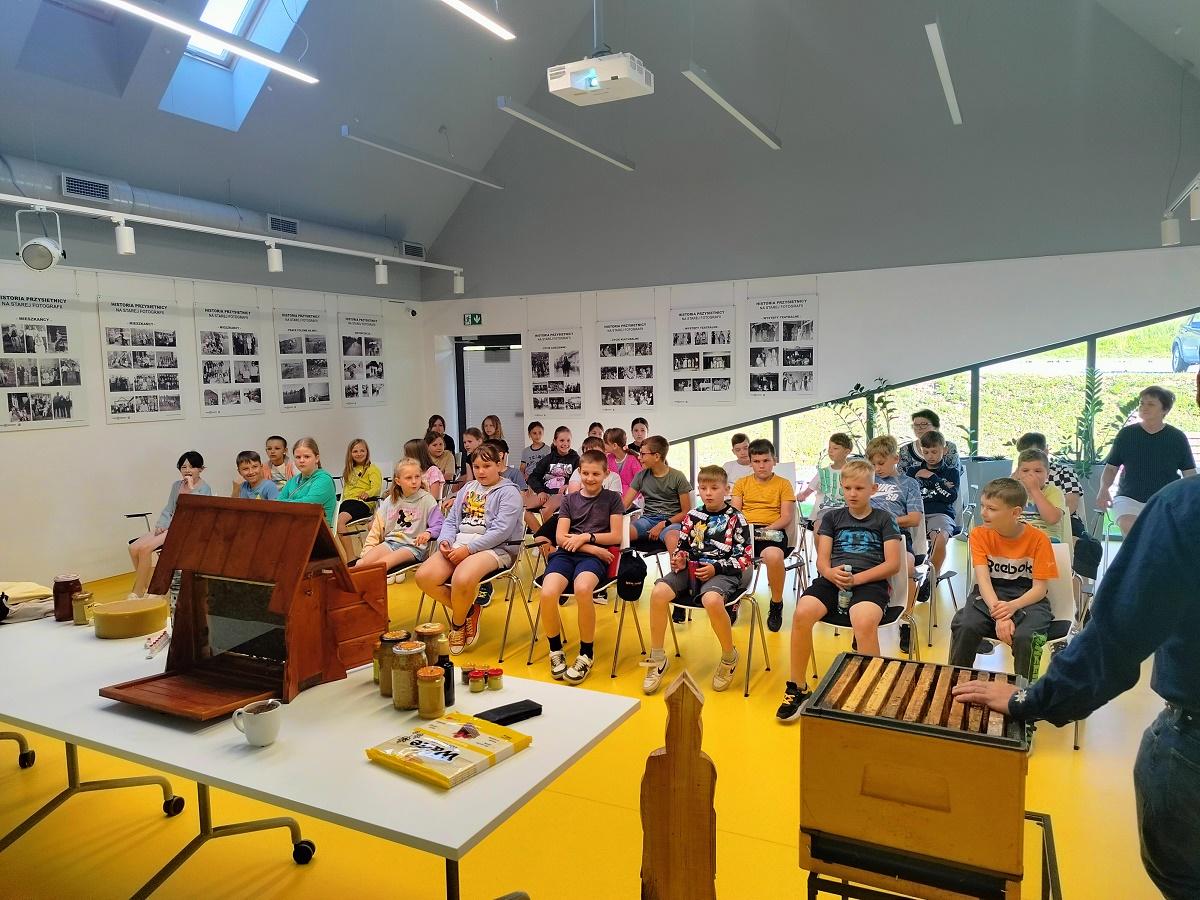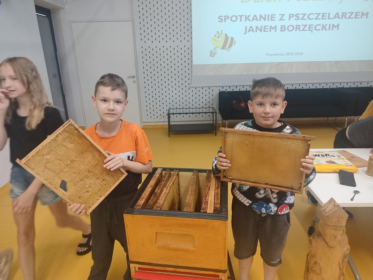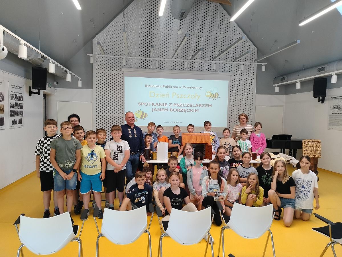 Dnia 28 maja 2024r. klasy 3a oraz 3b udały się do Biblioteki Publicznej w Przysietnicy na spotkanie z pszczelarzem p. Janem Borzęckim. Zaproszony gość przybył w towarzystwie swoich przyjaciół – pszczół, które przywiózł w specjalnym ulu. Dzieci obserwowały z bliska rój pszczół, odszukiwały królową. Miały możliwość poznania tajników związanych z życiem pszczół oraz produkcją miodu. Uczniowie poznali etapy rozwoju pszczoły, dowiedzieli się jaką rolę w ulu pełni królowa, robotnice, truteń, jak i gdzie pszczoły przenoszą pyłek kwiatowy oraz jak powstaje miód. Dzięki opowieściom pszczelarza dzieci zdobyły wiele cennych informacji i ciekawostek z życia pszczół. Dowiedziały się ile kwiatów muszą odwiedzić, aby zebrać nektar na kropelkę miodu, jak daleko odlatują od ula pszczoły zbieraczki, czym się żywią, jak spędzają zimę, jak długo żyją. Miały okazję zobaczyć strój pszczelarza, przymierzyć go oraz obejrzeć przybory, których używa w swojej codziennej pracy m.in. dymkę zwaną podkurzaczem. Spotkanie zakończyło się degustacją miodu. Najważniejszym jednak przesłaniem spotkania było uświadomienie najmłodszym, jak ważne jest istnienie pszczół dla ludzi. Dziękujemy za wspaniałą lekcję, poświęcony czas i przekazanie dzieciom cennych wiadomości.