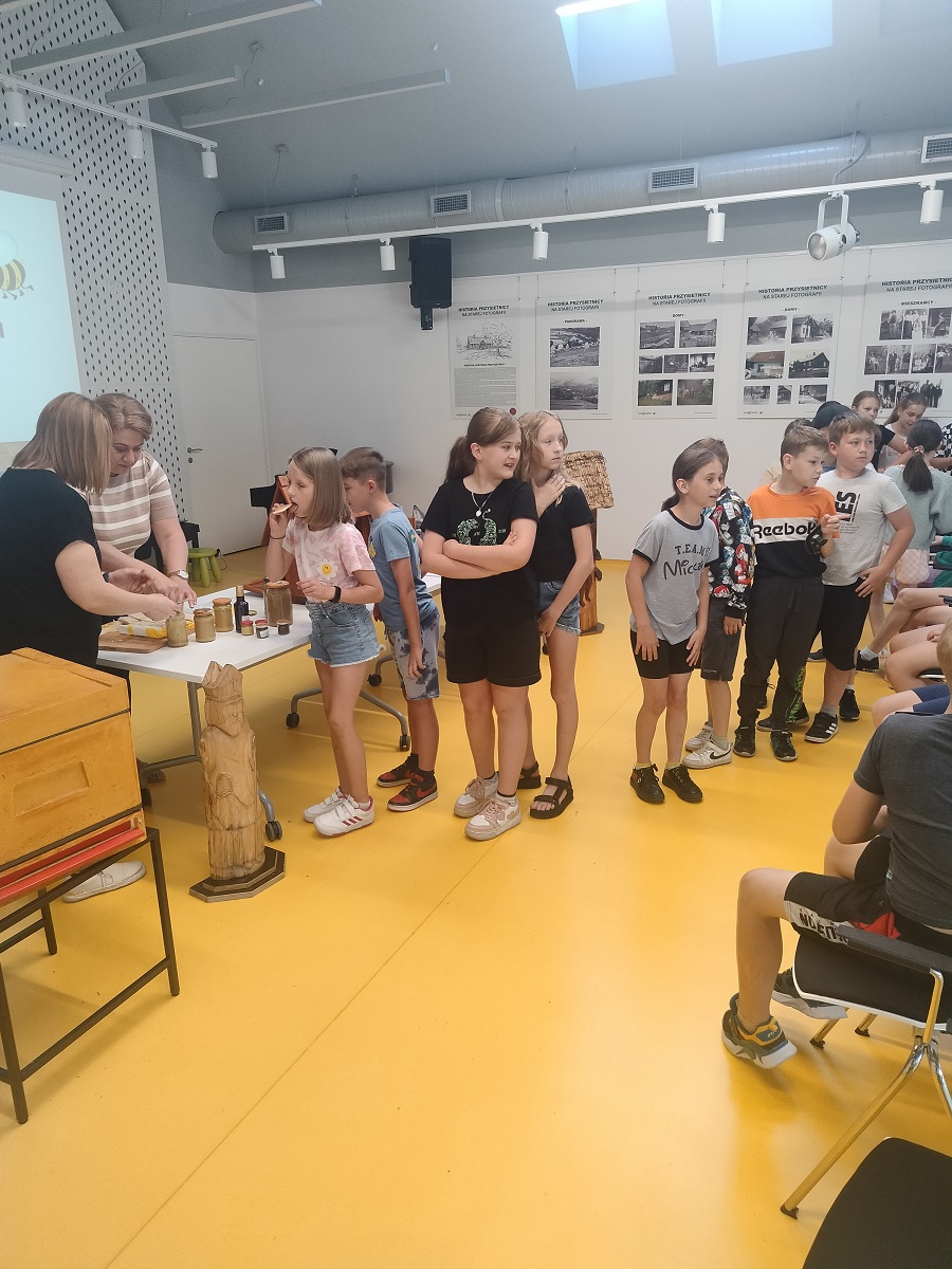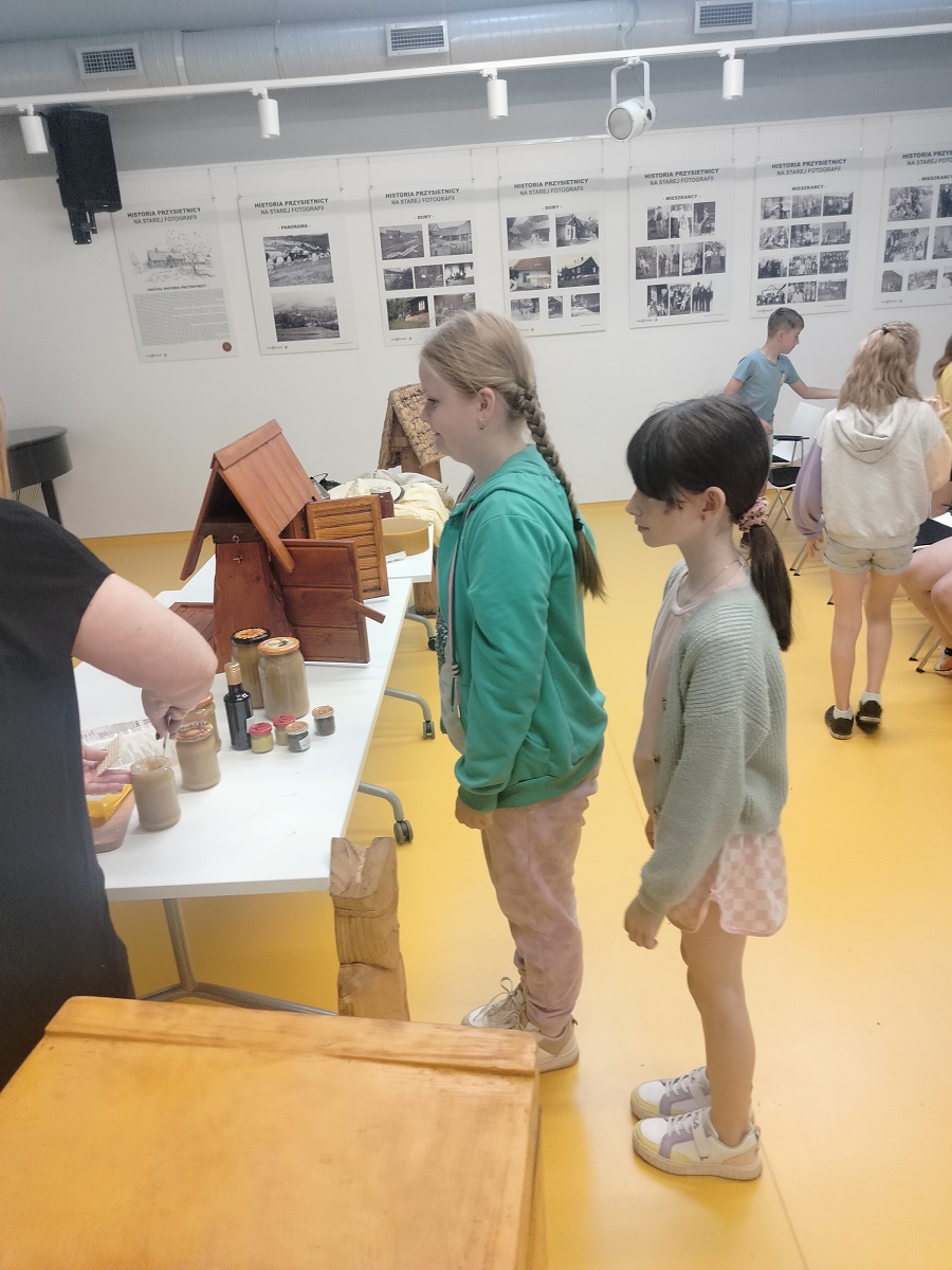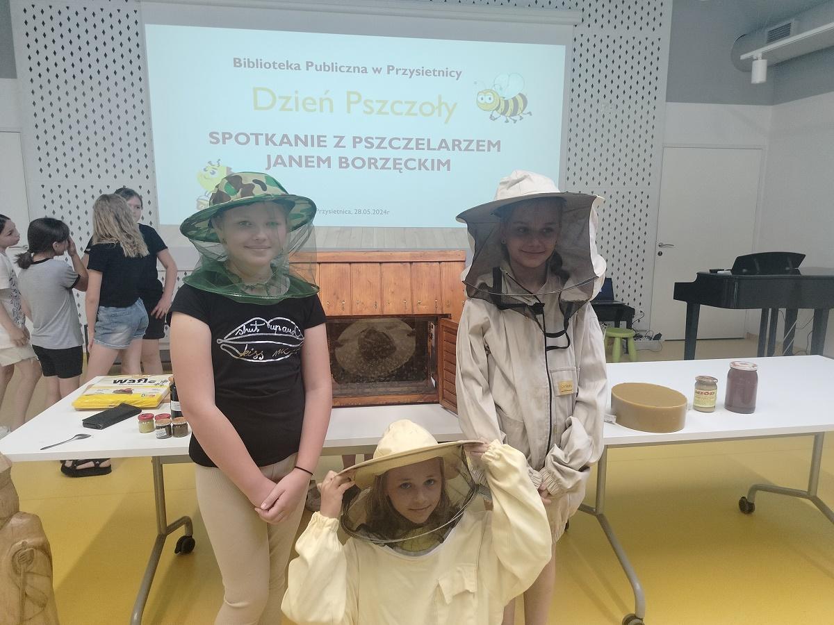 Dnia 28 maja 2024r. klasy 3a oraz 3b udały się do Biblioteki Publicznej w Przysietnicy na spotkanie z pszczelarzem p. Janem Borzęckim. Zaproszony gość przybył w towarzystwie swoich przyjaciół – pszczół, które przywiózł w specjalnym ulu. Dzieci obserwowały z bliska rój pszczół, odszukiwały królową. Miały możliwość poznania tajników związanych z życiem pszczół oraz produkcją miodu. Uczniowie poznali etapy rozwoju pszczoły, dowiedzieli się jaką rolę w ulu pełni królowa, robotnice, truteń, jak i gdzie pszczoły przenoszą pyłek kwiatowy oraz jak powstaje miód. Dzięki opowieściom pszczelarza dzieci zdobyły wiele cennych informacji i ciekawostek z życia pszczół. Dowiedziały się ile kwiatów muszą odwiedzić, aby zebrać nektar na kropelkę miodu, jak daleko odlatują od ula pszczoły zbieraczki, czym się żywią, jak spędzają zimę, jak długo żyją. Miały okazję zobaczyć strój pszczelarza, przymierzyć go oraz obejrzeć przybory, których używa w swojej codziennej pracy m.in. dymkę zwaną podkurzaczem. Spotkanie zakończyło się degustacją miodu. Najważniejszym jednak przesłaniem spotkania było uświadomienie najmłodszym, jak ważne jest istnienie pszczół dla ludzi. Dziękujemy za wspaniałą lekcję, poświęcony czas i przekazanie dzieciom cennych wiadomości.