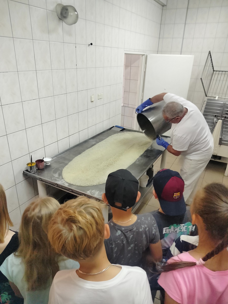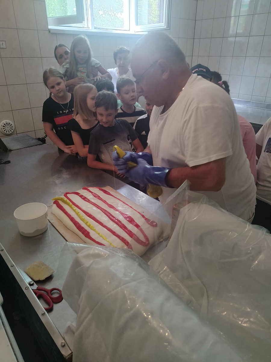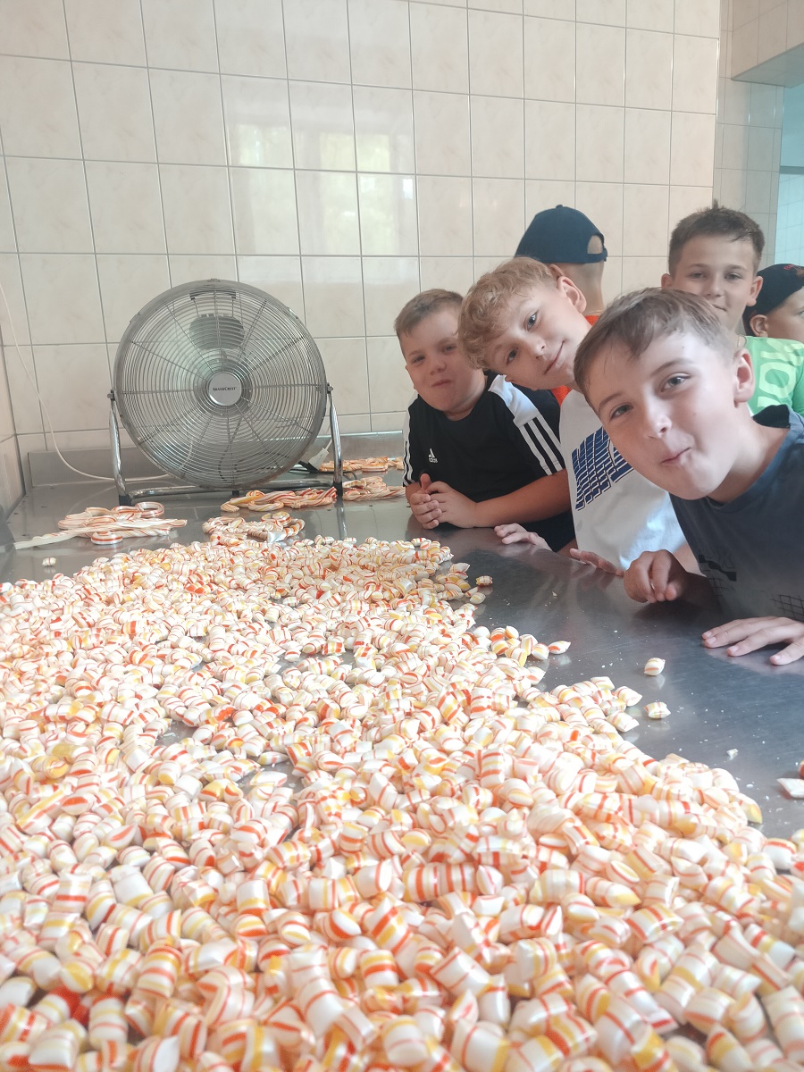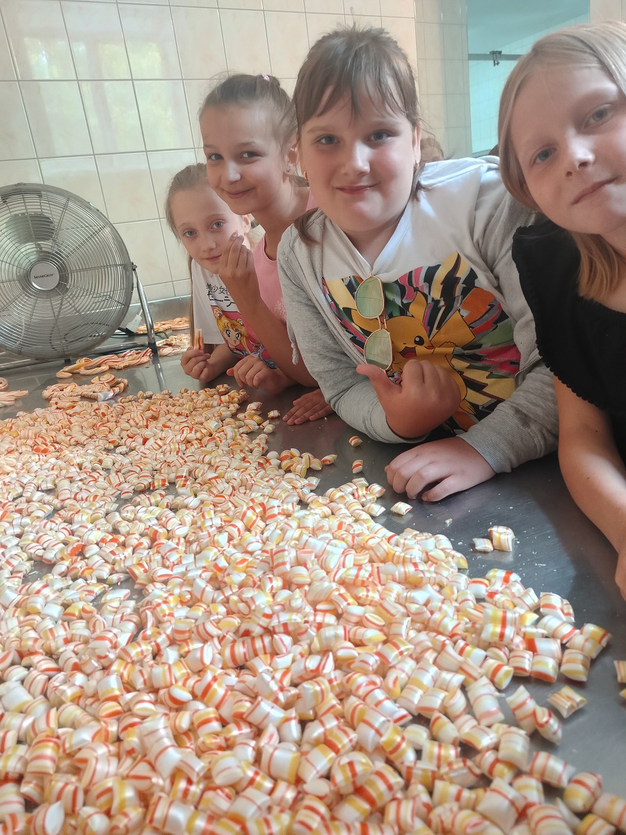 3 czerwca z okazji Dnia Dziecka klasy 3 a i 3 b miały zorganizowaną wycieczkę do Zakładu Cukierniczego na pokaz ręcznego robienia lizaków i cukierków. Pokaz rozpoczynał się od zagotowania i wylania gorącej masy na specjalny stół. Następnie dodawany był kwas i aromat, który nadaje cukierkom określony smak. Później poszczególne części masy są zabarwiane tak, aby mógł powstać określony wzór. Bardzo interesujące, było tzw. rozciąganie cukru, czyli napowietrzanie, które sprawiło, że zmienił on kolor. Następnie uczniowie obserwowali produkcję cukierków oraz sami z ciepłej jeszcze masy wykonywali swoje produkty. Na koniec pakowali swoje wyroby i cukierki do specjalnych woreczków i zabierali ze sobą. To był smakowity i pełen słodkości Dzień Dziecka. Dziękujemy właścicielom Państwu Madziarom, którzy bardzo serdecznie i ciepło przyjęli dzieci. Przygotowali dla nich poczęstunek oraz użyczyli swojego pięknego ogrodu na gry i zabawy dla dzieci. Dziękujemy również Rodzicom za zorganizowanie tej ważnej dla dzieci uroczystości.
