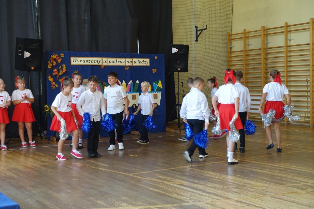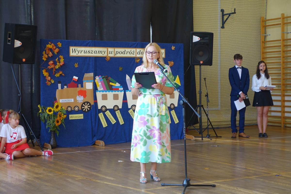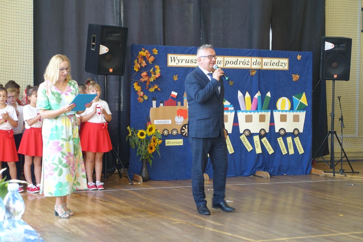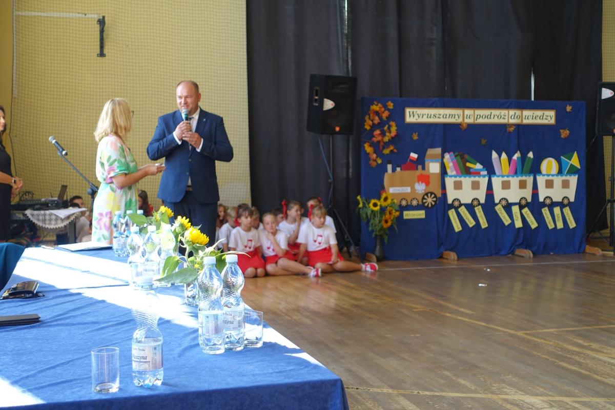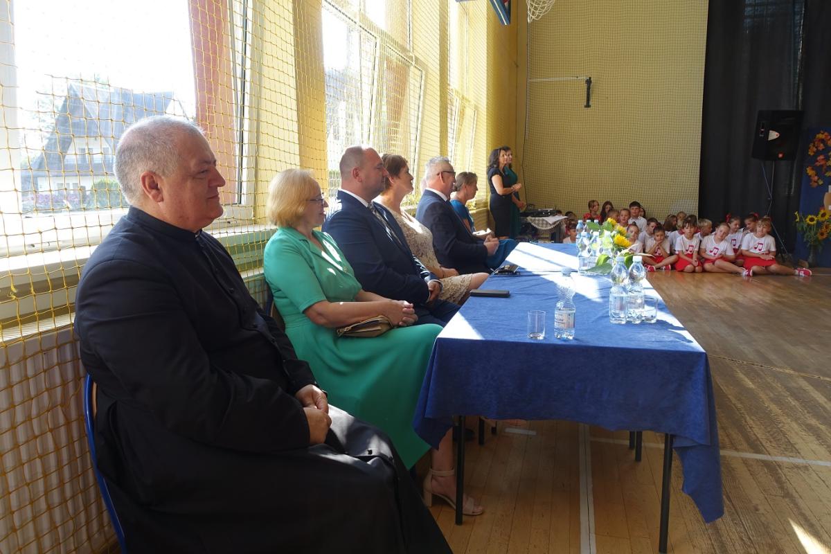 Pani dyrektor powitała nauczycieli, rodziców, uczniów oraz zaproszonych gości: wiceburmistrza Kazimierza Gizickiego, byłą dyrektor szkoły p. Zofię Golonkę, księdza prałata Jana Wąchałę, radną panią Bożenę Ogorzały, radnego, sołtysa oraz przewodniczącego Rady Rodziców pana Jana Tokarczyka.