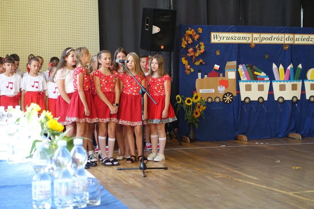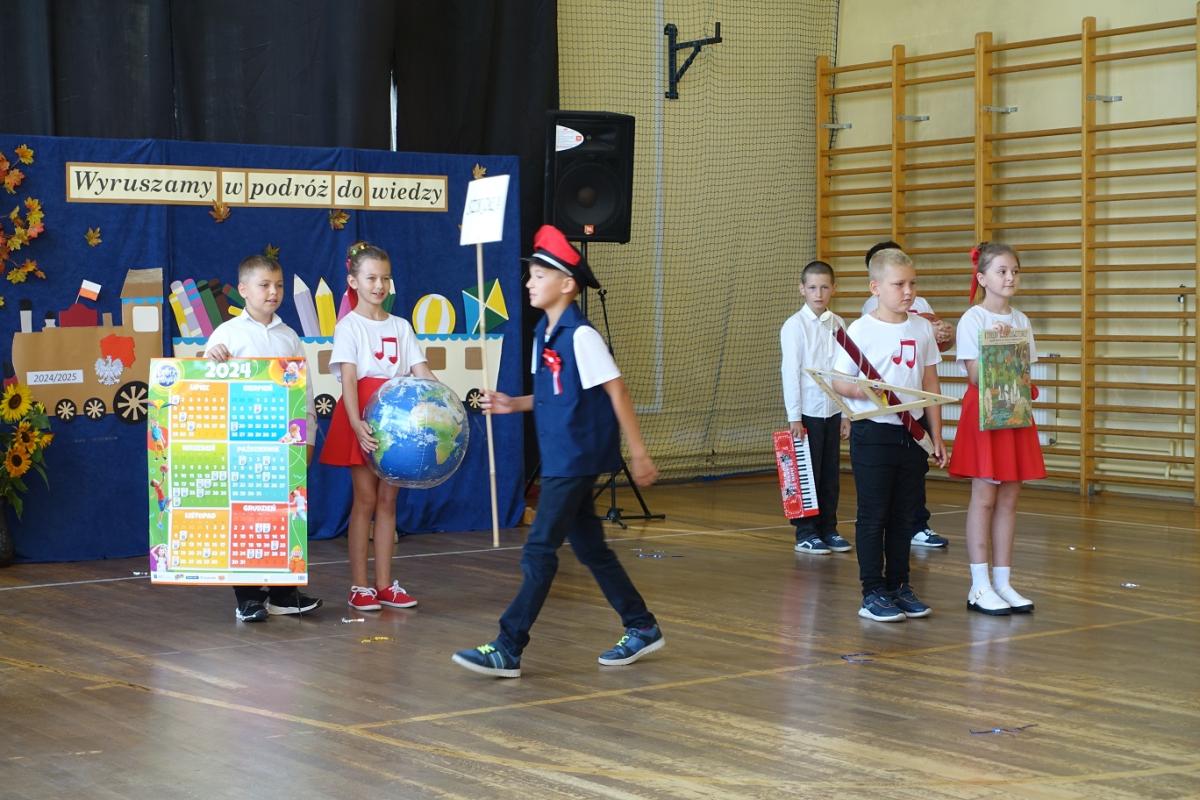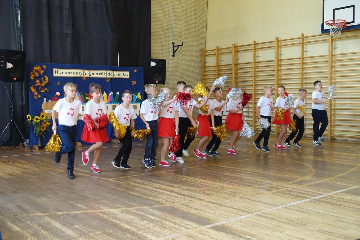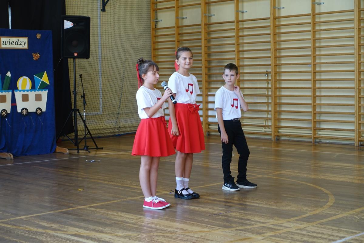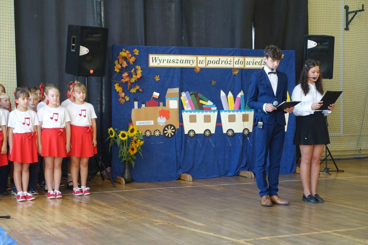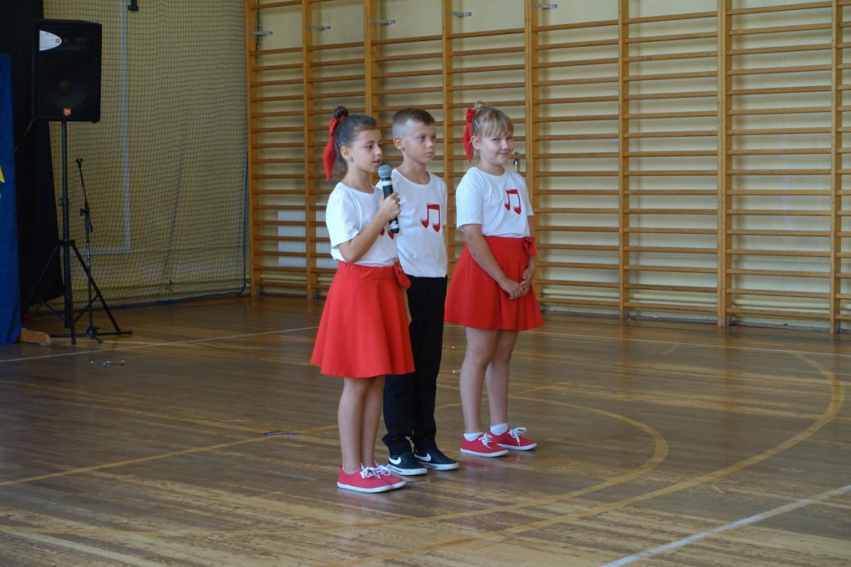 Pani dyrektor powitała nauczycieli, rodziców, uczniów oraz zaproszonych gości: wiceburmistrza Kazimierza Gizickiego, byłą dyrektor szkoły p. Zofię Golonkę, księdza prałata Jana Wąchałę, radną panią Bożenę Ogorzały, radnego, sołtysa oraz przewodniczącego Rady Rodziców pana Jana Tokarczyka.