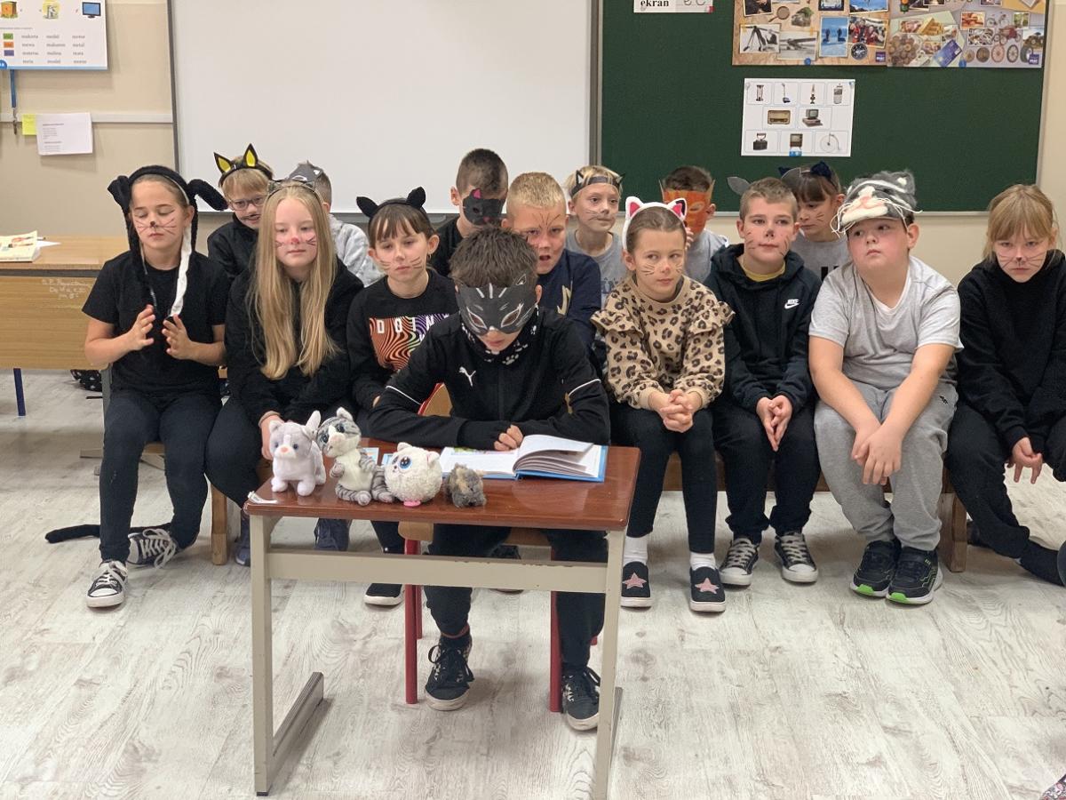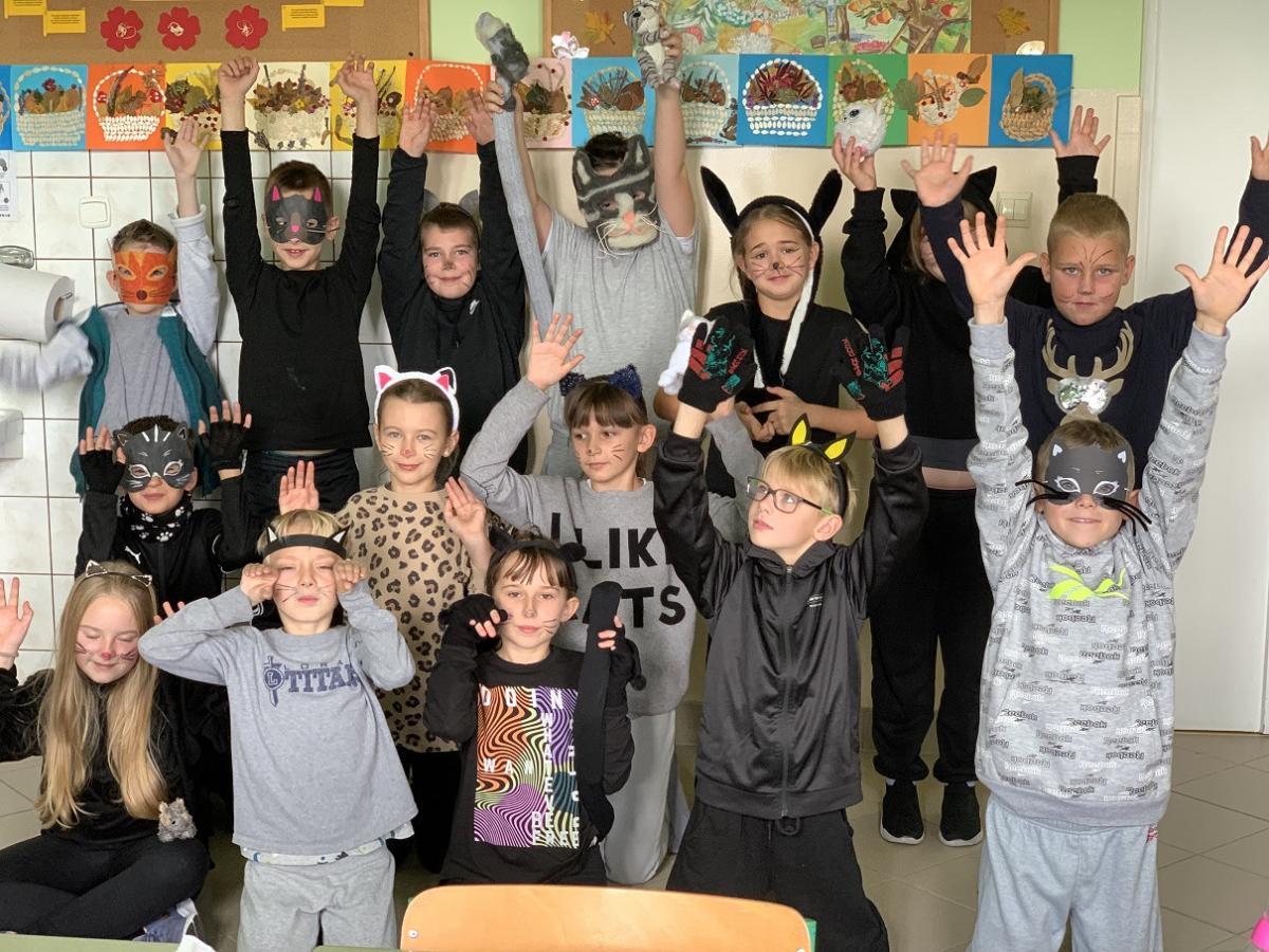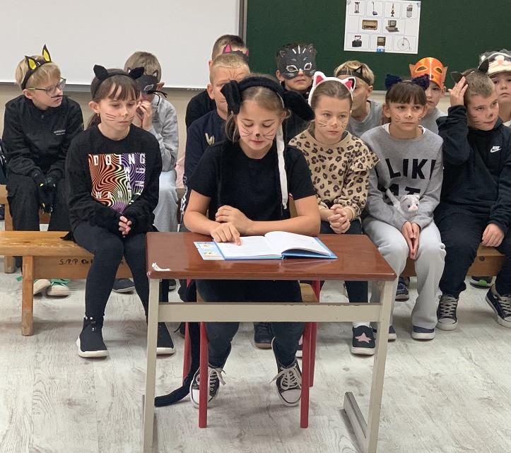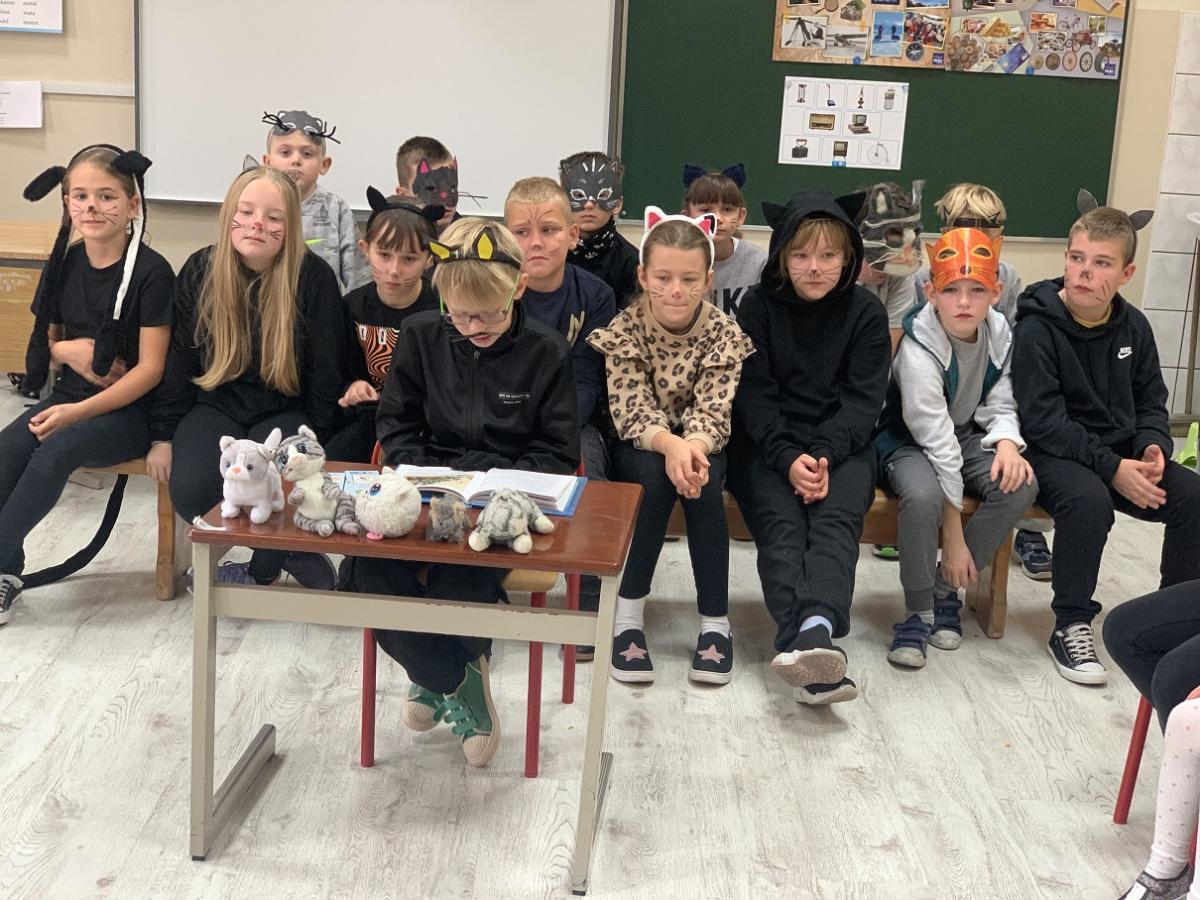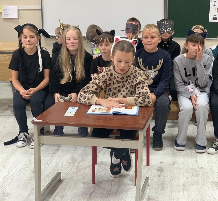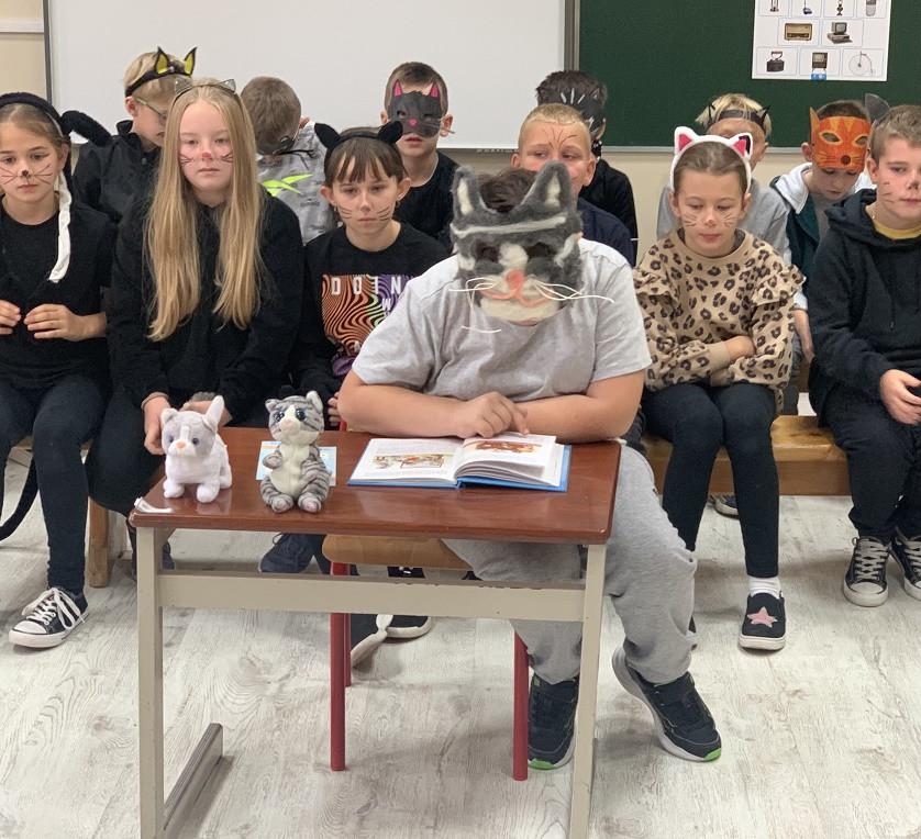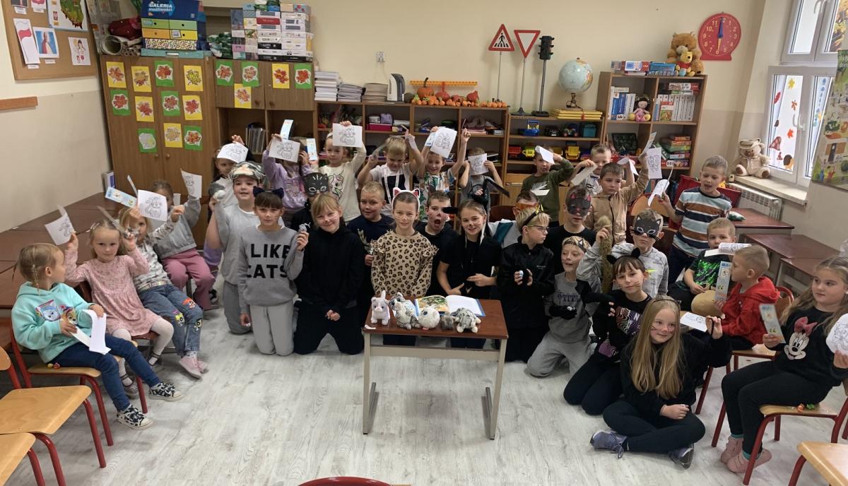 W Oddziale Przedszkolnym 02 rozpoczęli realizację zadania z 1 modułu. 16 października, pełni radosnych emocji, ucharakteryzowani w kotki zawitali do dzieci. Każdy z uczniów wzorowo przeczytał  fragment  książki W. Cichonia „Cukierku, ty łobuzie”.  Lektura bardzo podobała się dzieciom, które  żywo reagowały na przygody kotka. Chętnie odpowiadały na przygotowane pytania. Mówiły jakie emocje towarzyszyły bohaterom opowiadania, kiedy podobne emocje im towarzyszą.