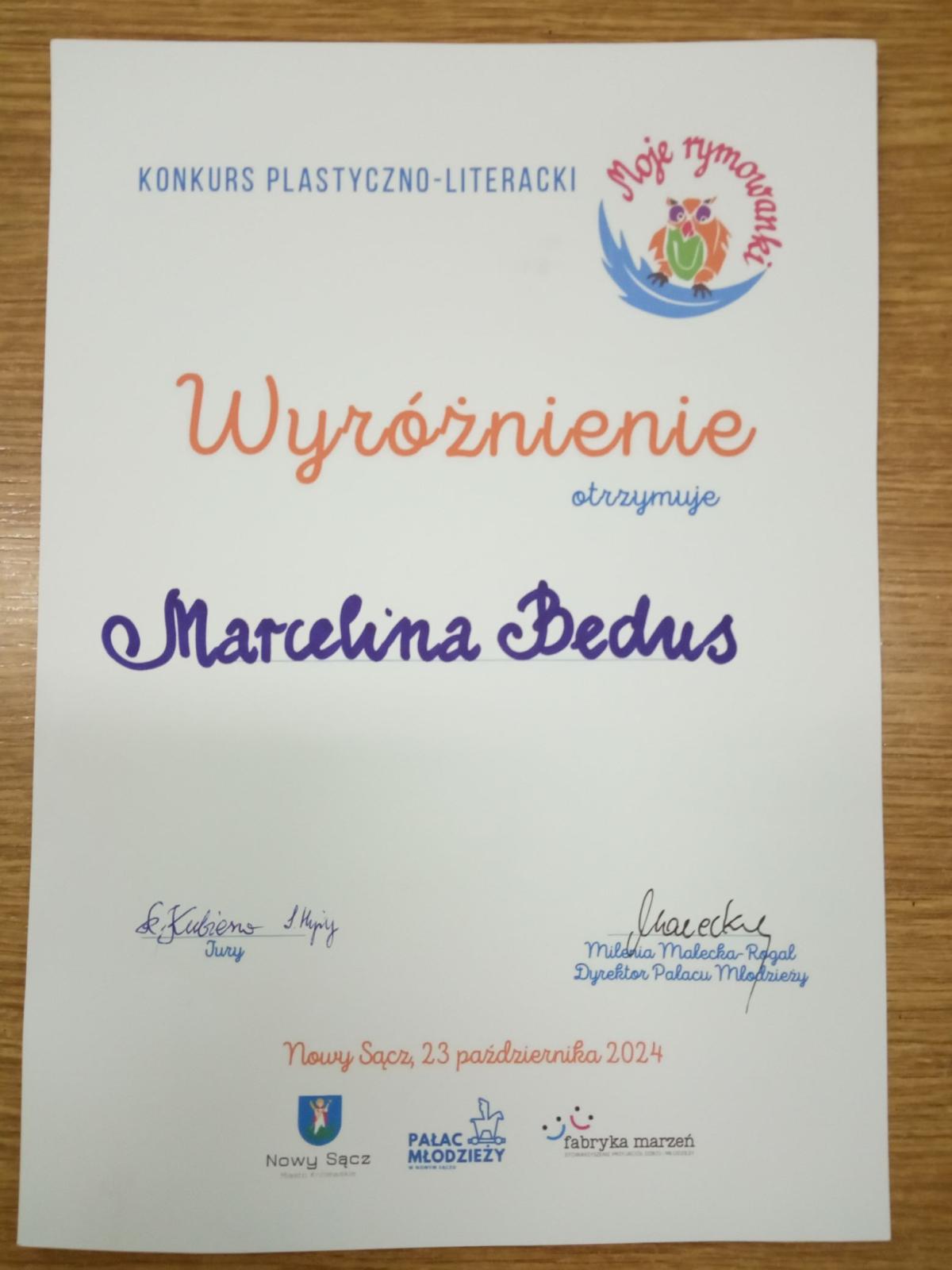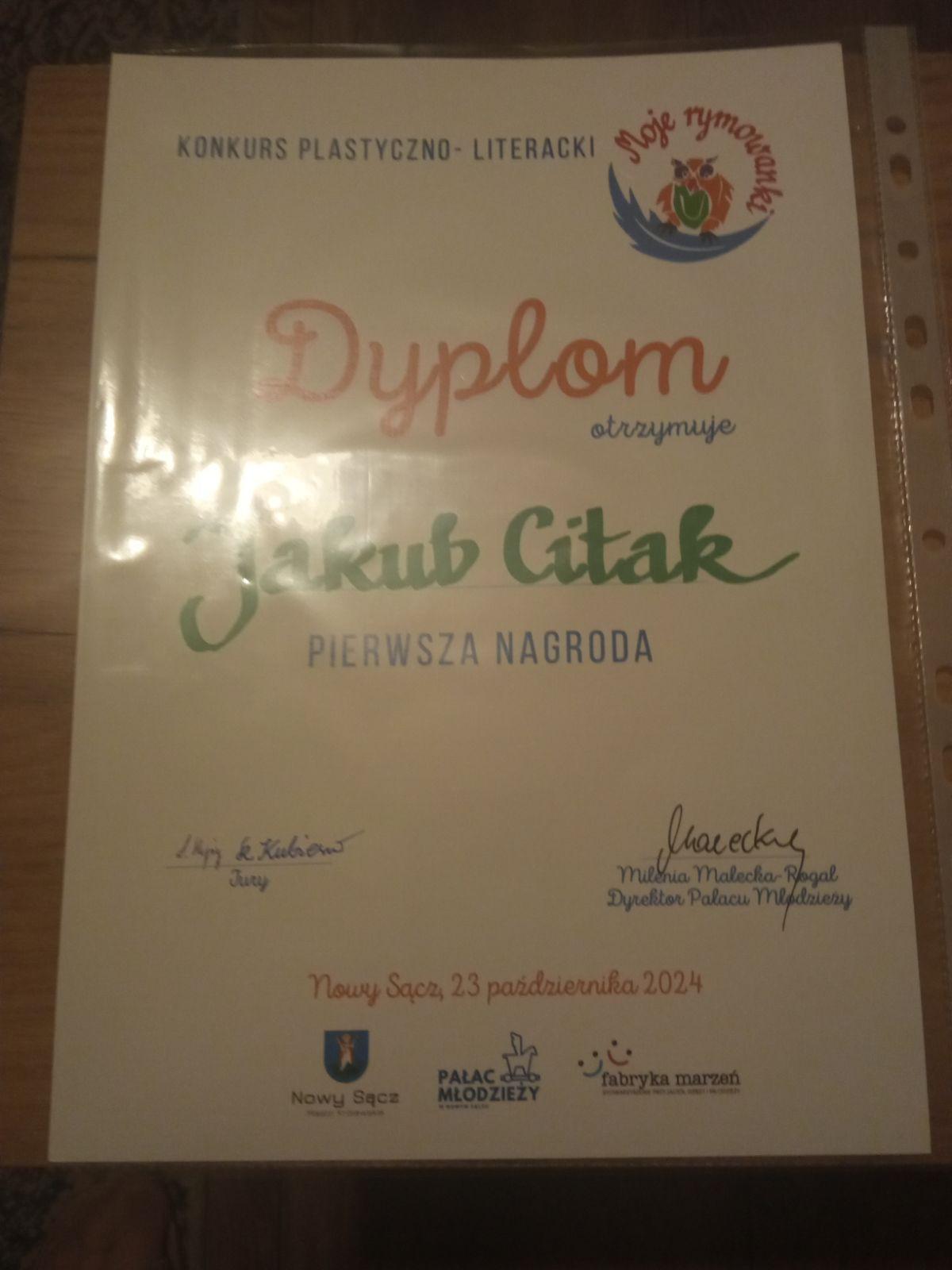Uczniowie naszej szkoły wzięli udział w powiatowym konkursie „Moje rymowanki” zorganizowanym przez Pałac Młodzieży w Nowym Sączu oraz Stowarzyszenie Przyjaciół Dzieci i Młodzieży „Fabryka Marzeń”. Celem konkursu było rozwijanie uzdolnień twórczych i doskonalenie umiejętności literackich, rozbudzanie wrażliwości na piękno języka ojczystego oraz upowszechnianie kultury żywego słowa wśród dzieci. Zadaniem uczestników było ułożenie zestawu rymowanek o dowolnej tematyce, wykonanie rysunku i stworzenie pracy literacko-plastycznej w formie książeczki, pamiętnika lub segregatora.